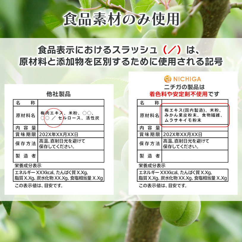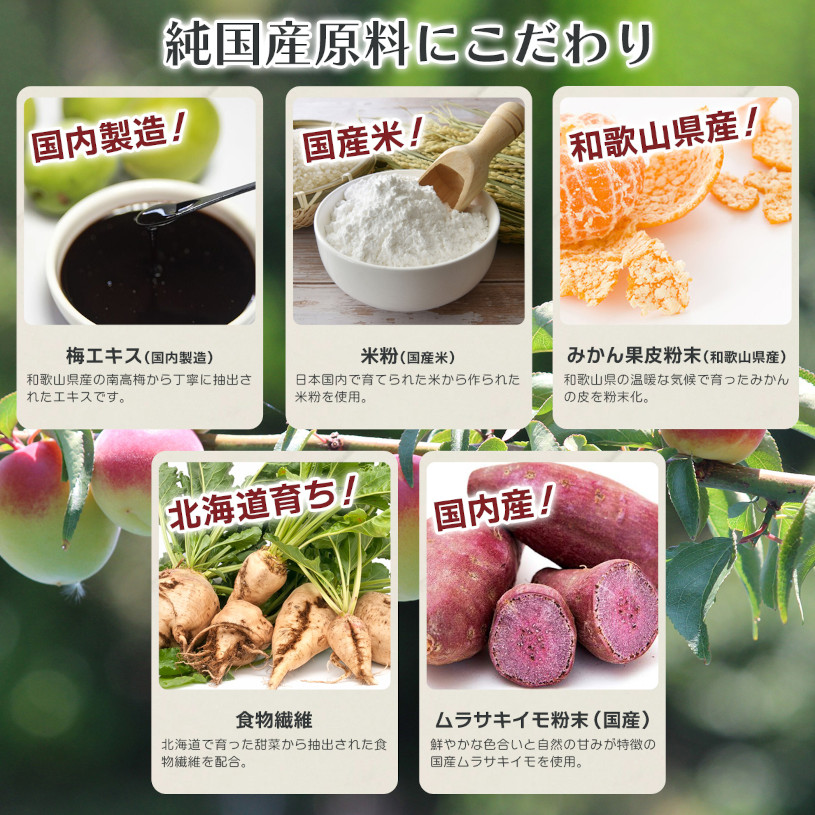 | 原材料名 | 梅エキス(国内製造)[梅:和歌山県]、米粉[国産米]、みかん果皮粉末[和歌山県]、食物繊維[甜菜:北海道産]、ムラサキイモ粉末[国産] |