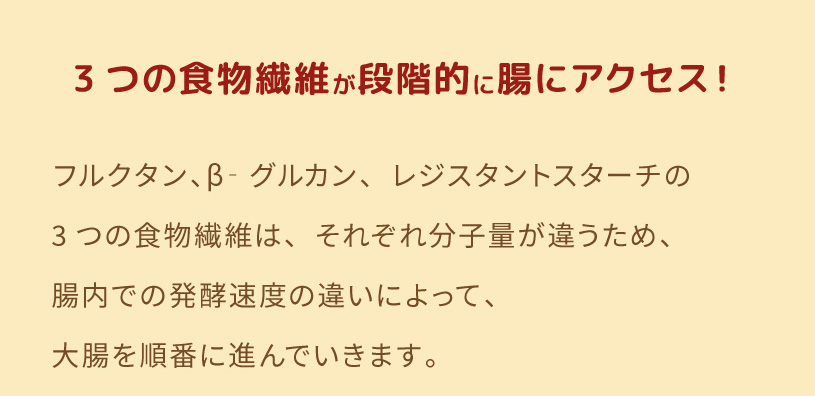 スーパー大麦「バーリーマックス®」は、オーストラリア連邦科学産業研究機構が開発した大麦で、一般の大麦に比べて2倍の食物繊維量と、4倍のレジスタントスターチを含むスーパーフードです。また、β-グルカンやフルクタンといった水溶性食物繊維も含有。発酵速度の違う3つの食物繊維で腸の入り口から腸の奥まで届きます。