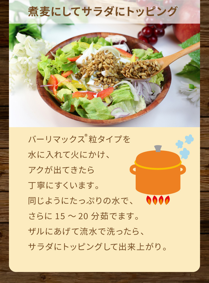 【美味しい炊き方】 1.研いだお米1合に、通常のお水加減と本品大さじ2杯(約30g)を加えて水50~60ccを追加で入れます。軽くかき混ぜ炊飯。 【茹でてプリプリに】 1.本品を沸騰したお湯で10分から20分茹で、ザルにあげて粗熱をとり、しっかり水を切る。 2.白米と混ぜて炊く。小分けして冷凍もOK。 ゆでたバーリーマックスを、サラダやスープなどお好みのお料理に加えて召し上がってください。 |