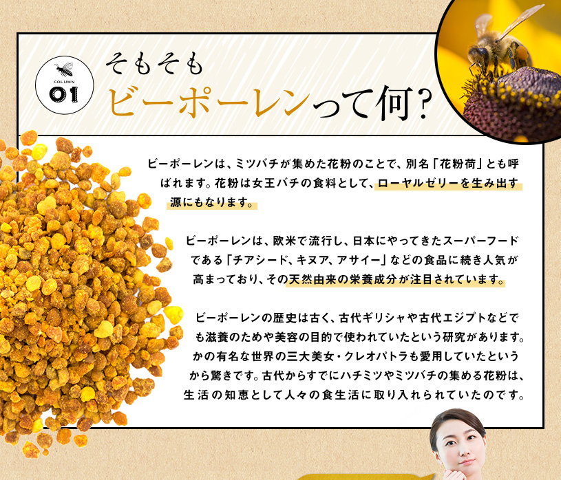 花粉荷とは、ミツバチが花々より集めた花粉を蜜で固めたもので、ローヤルゼリーの原料となるもので栄養価に優れています。