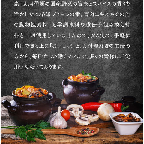 【国産野菜と香辛料で仕込んだ本格派国産ブイヨン(化学調味料無添加・動物性素材不使用・遺伝子組換え材料不使用)】