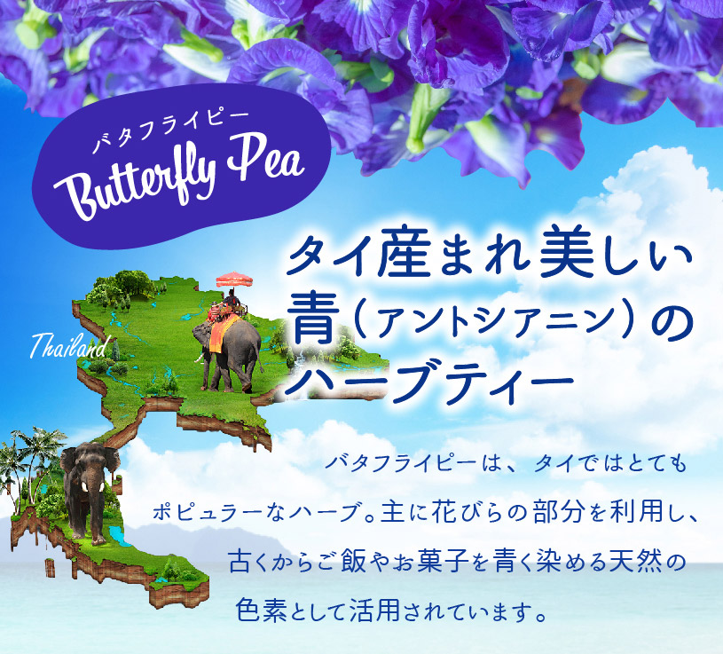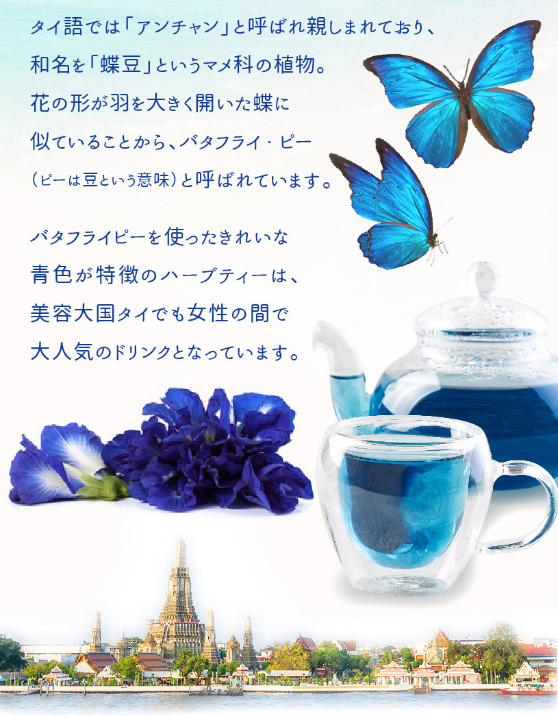タイ原産のハーブで、「青いお茶」ブルーハーブ バタフライ・ピー(蝶豆、チョウマメ、クリトリア・テルナテア)、タイ語でアンチャンといいます。見た目は日本にも咲いているツユクサのような青い花で、マメ科の植物です。お茶に使うのは花の部分で、花を摘み取って乾燥させたものがバタフライピー茶です。