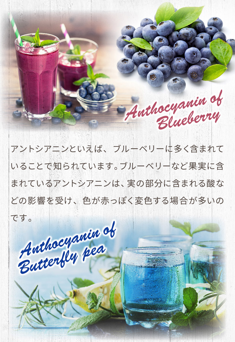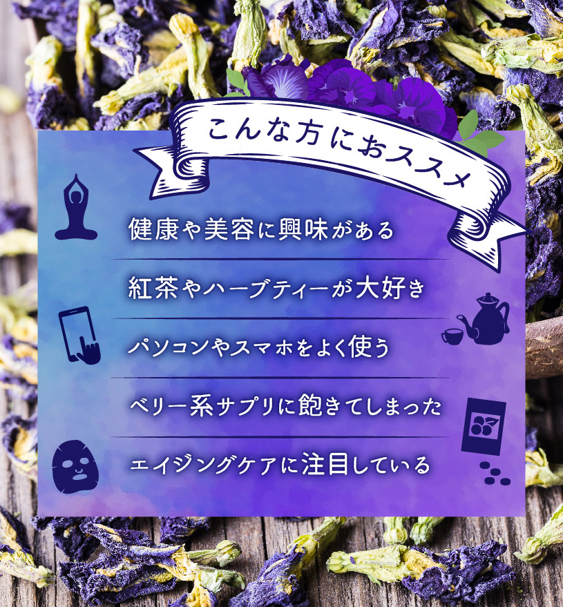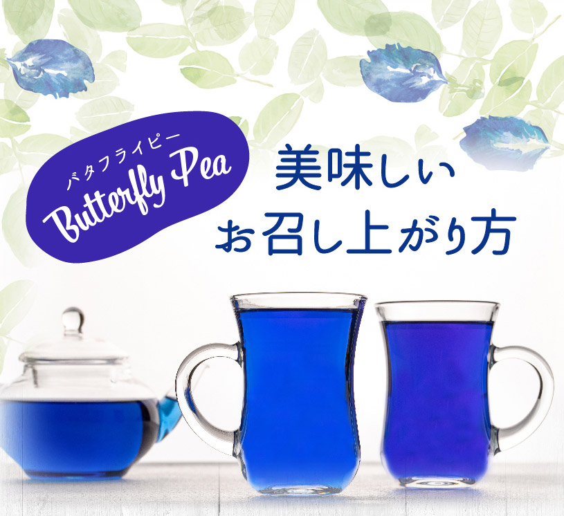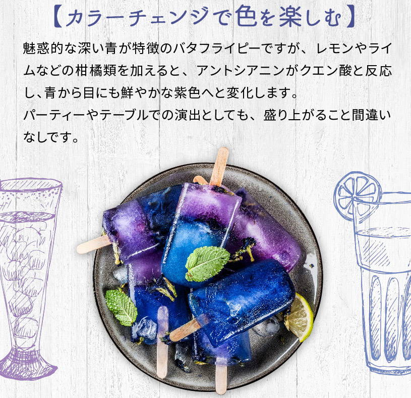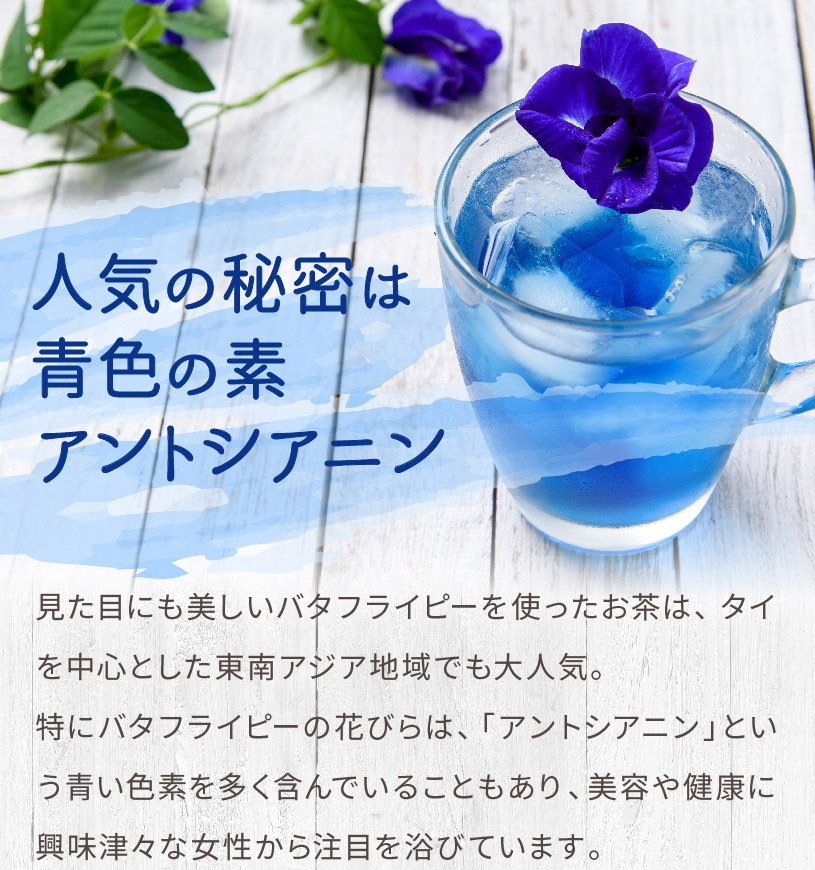 その見た目のブルーの美しさと、レモンやライムなどのクエン酸で青から紫に変化する幻想的な演出で、美容・健康に人気の花茶です。