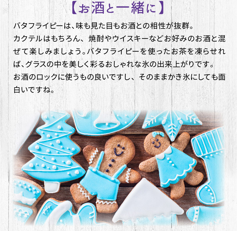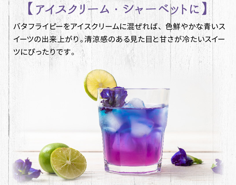【ホット】 耐熱容器にバタフライピー約1gを入れて200~300mlの熱湯を注ぎ、よくかき混ぜて色素成分を十分に抽出してからお飲み下さい(煮出しも可能)。色の濃さは花の量で調節してください。 【アイス】 ホットより濃く抽出し、氷を入れたグラスに注ぎます。作り置きをする場合、抽出後によく冷ましてから冷蔵庫で保存して下さい。 お好みでレモンやライムを加えると、紫色~ピンク色に変化します。 炭酸飲料と混ぜていただいてもおいしくお飲み頂け、見た目にも美しい健康ドリンクになります。 ※量はお好みによりご調節ください。バタフライピーは、ホットでもアイスでも美味しく頂けます! |