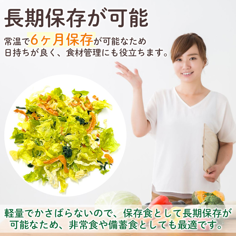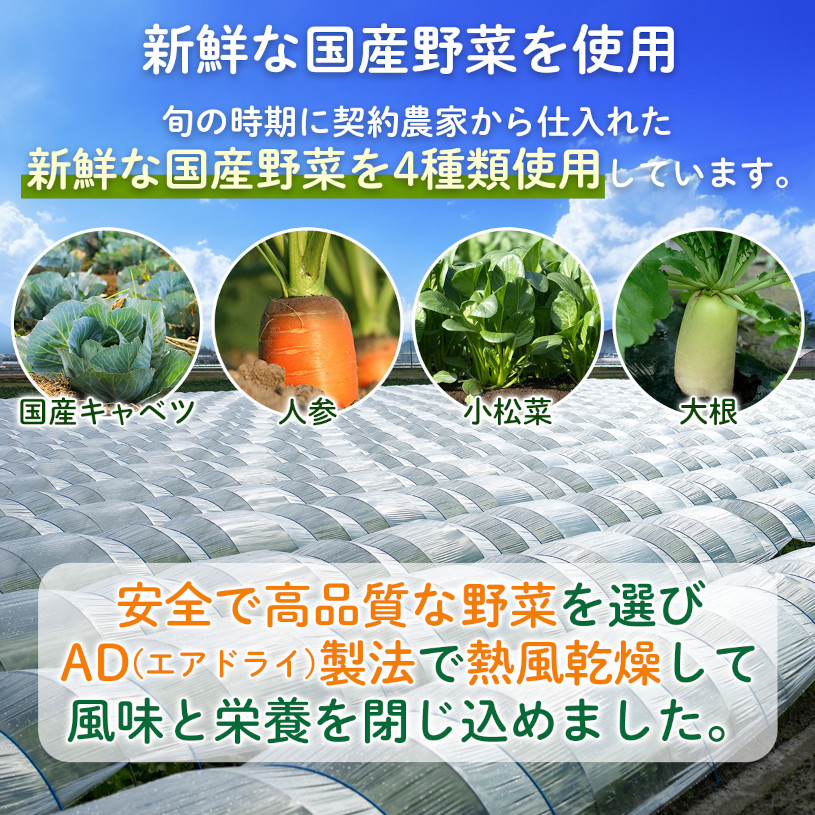 旬の時期に直接契約農家から仕入れた新鮮な国産野菜4種類を、AD製法にて熱風乾燥してブレンドしました。