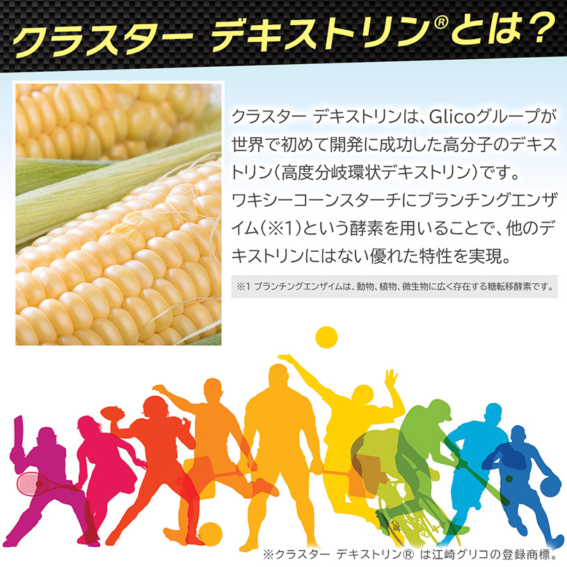 クラスター デキストリン®とは、Glicoグループが世界で初めて開発に成功した高分子のデキストリン(高度分岐環状デキストリン)です。エネルギーが長時間持続するので、マラソンやトライアスロンなどの持久系スポーツに最適です。甘味やデンプン特有の粉臭さがほとんどなく純粋な味わいなので、どんなドリンクにも混ぜやすくなっております。