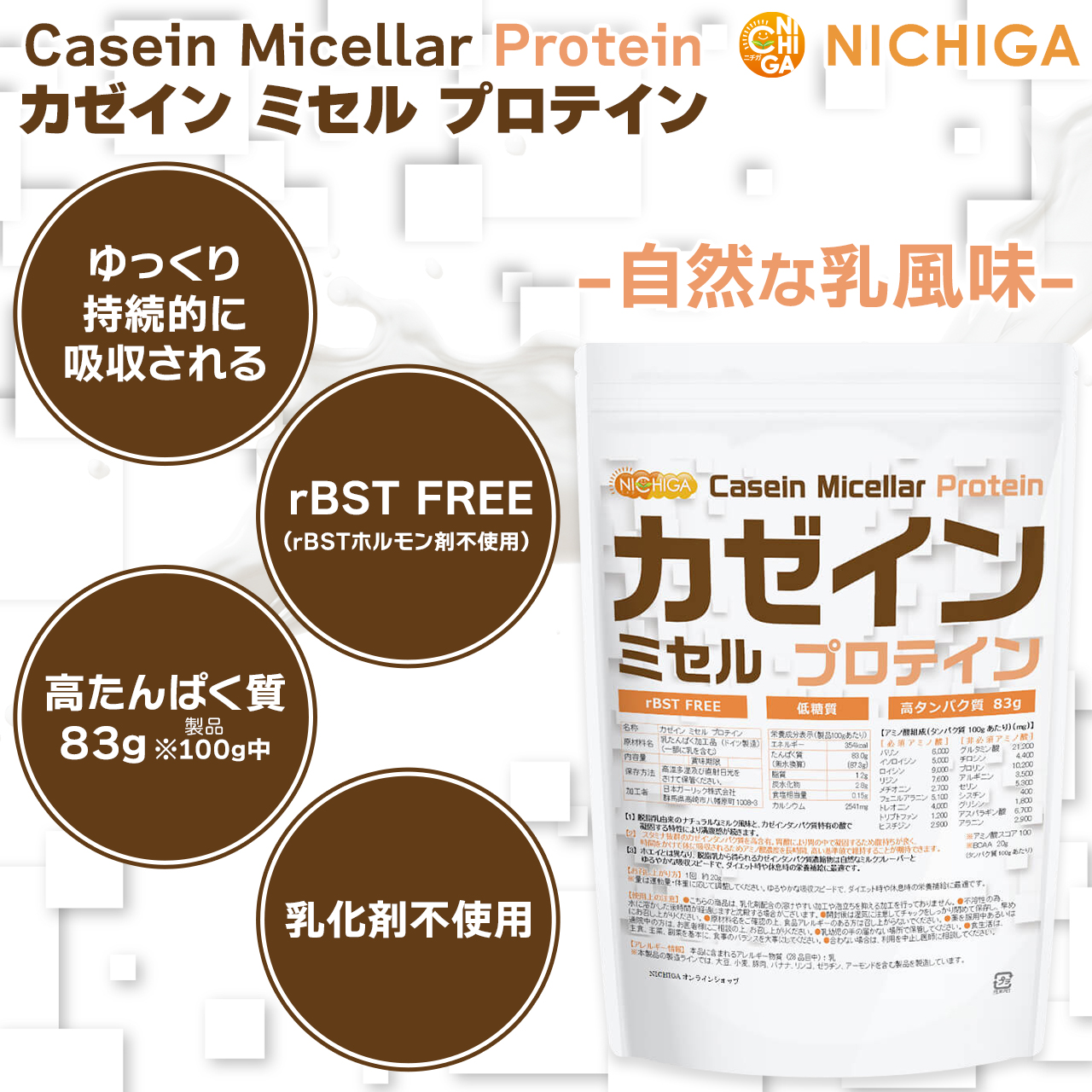 カゼイン ミセル プロテイン 1kg×3袋【送料無料!(沖縄を除く)】 Casein Protein プレーン味 高タンパク質 低糖質 乳化剤不使用・甘味料不使用・香料不使用 NICHIGA(ニチガ) TKS