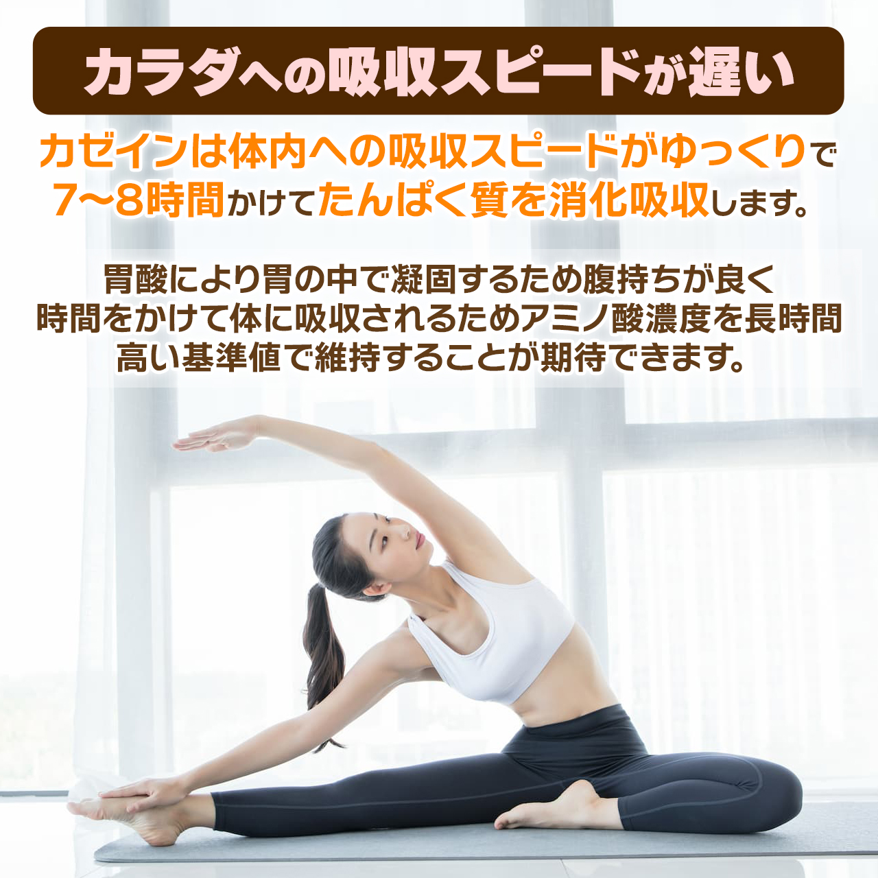 2.スタミナ抜群のカゼインタンパク質を高含有。胃酸により胃の中で凝固するため腹持ちが良く、時間をかけて体に吸収されるためアミノ酸濃度を長時間、高い基準値で維持することが期待できます。