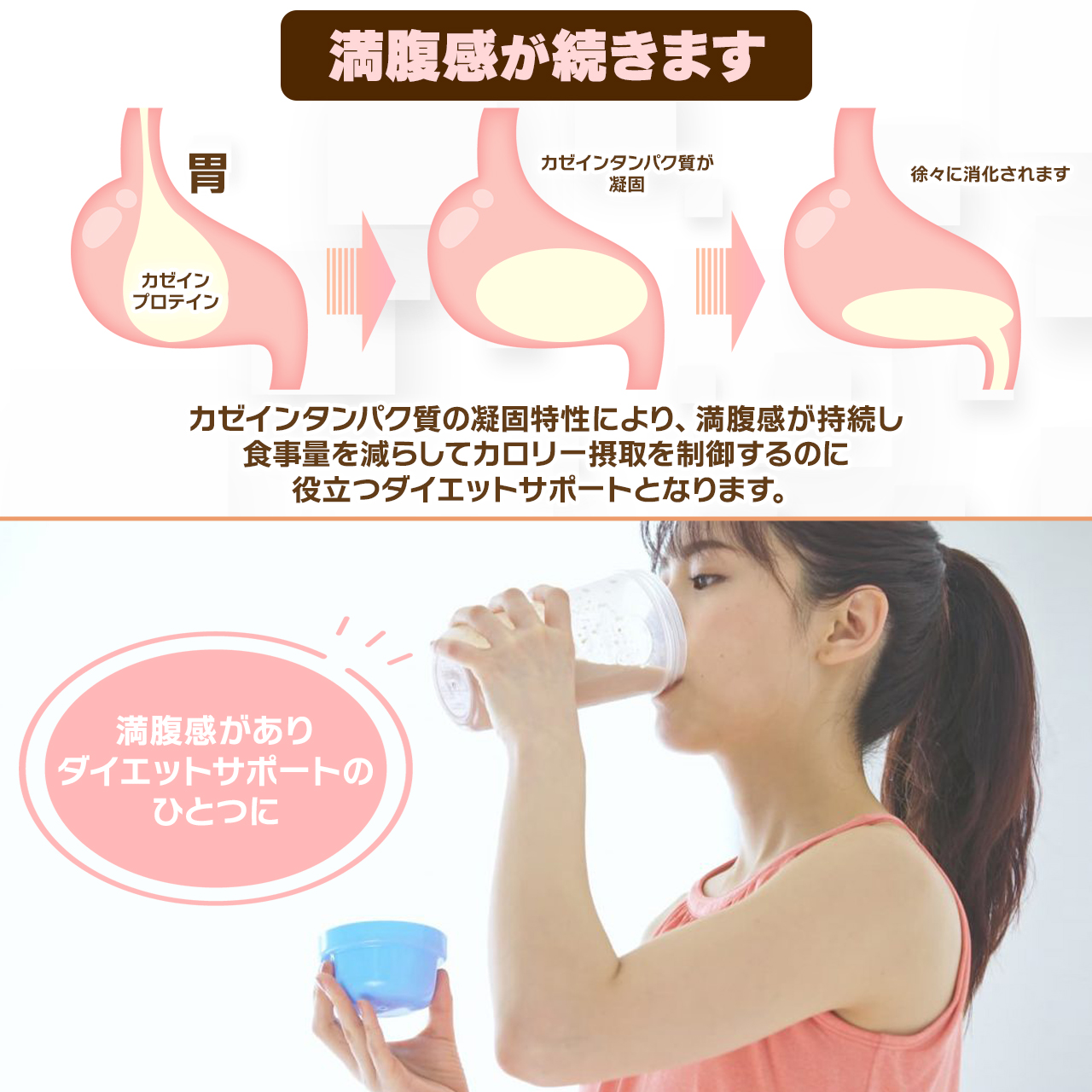 1.脱脂乳由来のナチュラルなミルク風味と、カゼインタンパク質特有の酸で凝固する特性により満腹感が続きます。