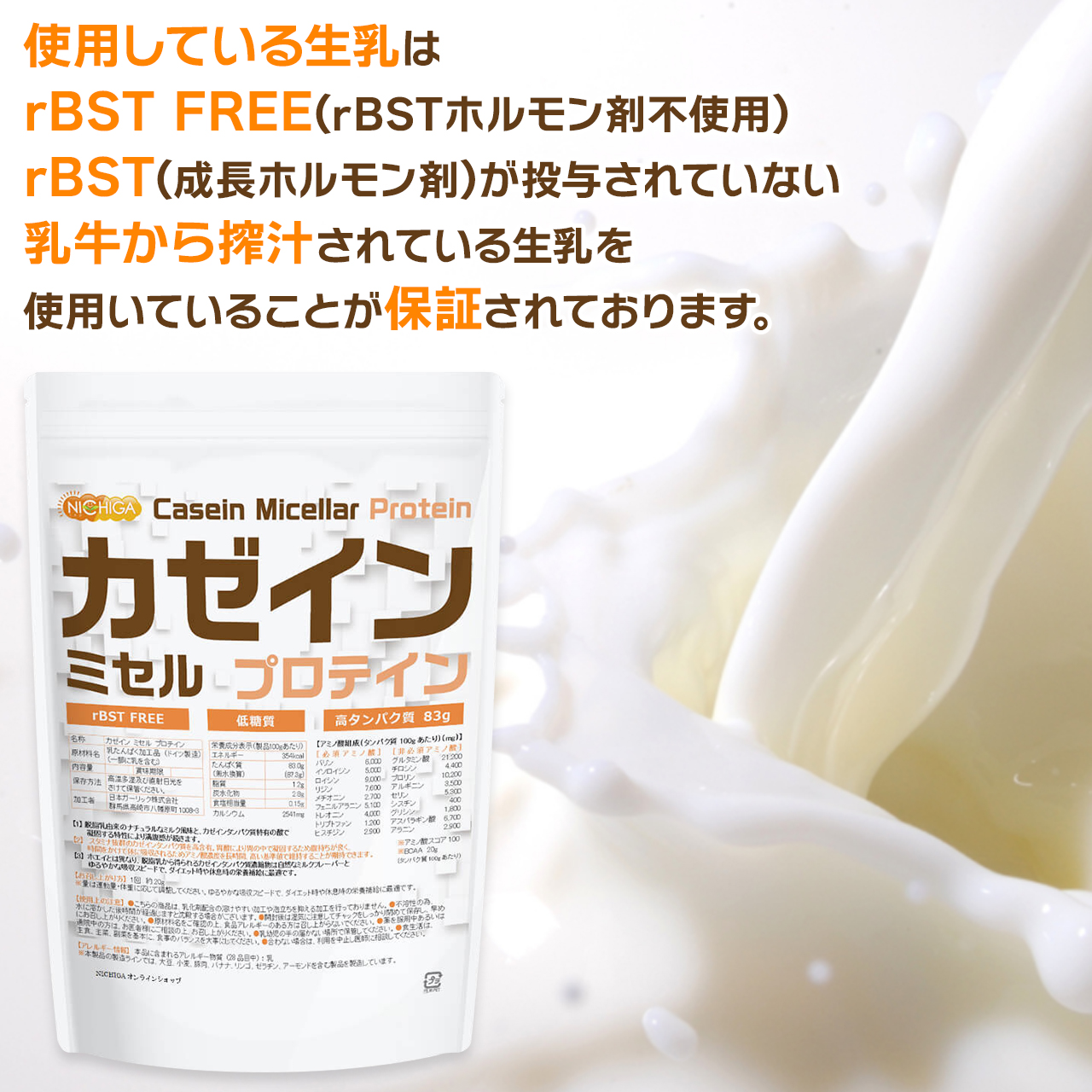 | rBST | rBST(成長ホルモン剤)が投与されていない乳牛から搾汁されている生乳を使用いていることが保証されております。 |