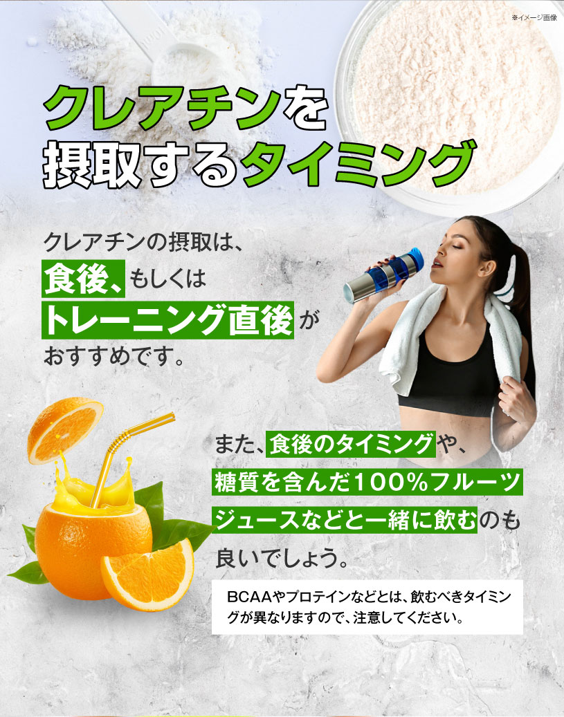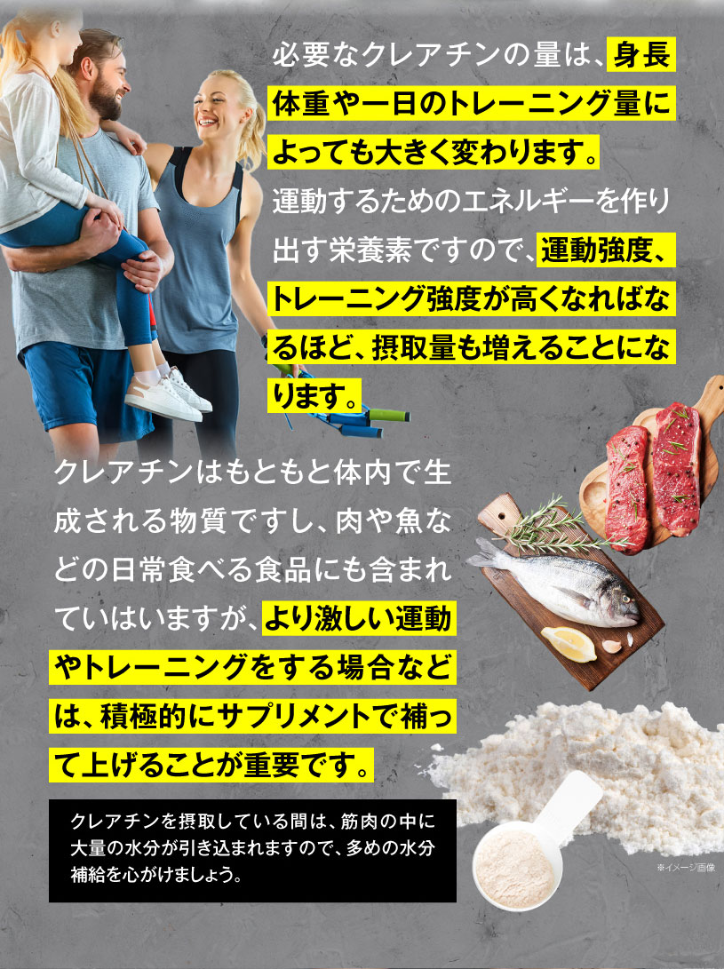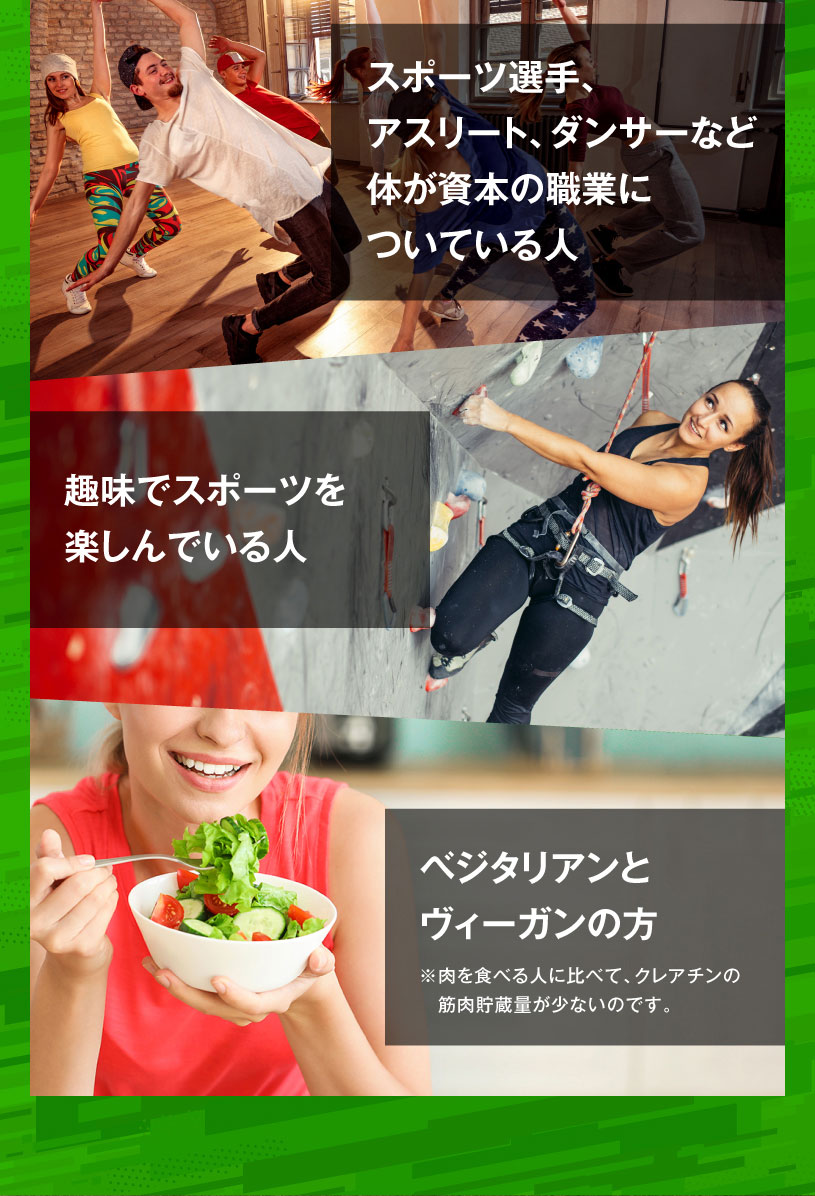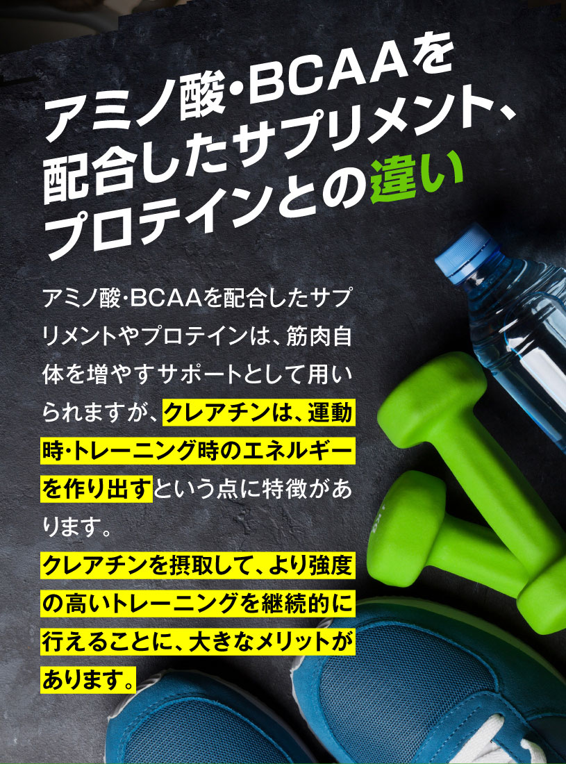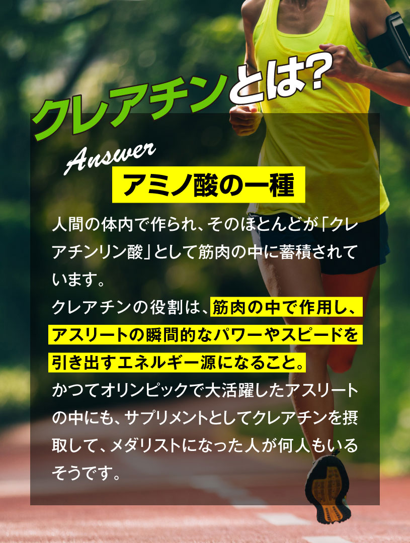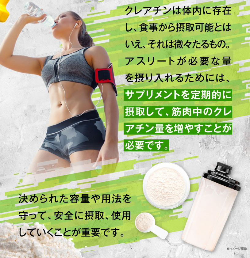 クレアチンは体内で合成されるアミノ酸で、筋肉中に存在しています。瞬発力、パワー、スピードが重要視される爆発的な運動時のエナジーサポートとして期待ができるサプリメントです。