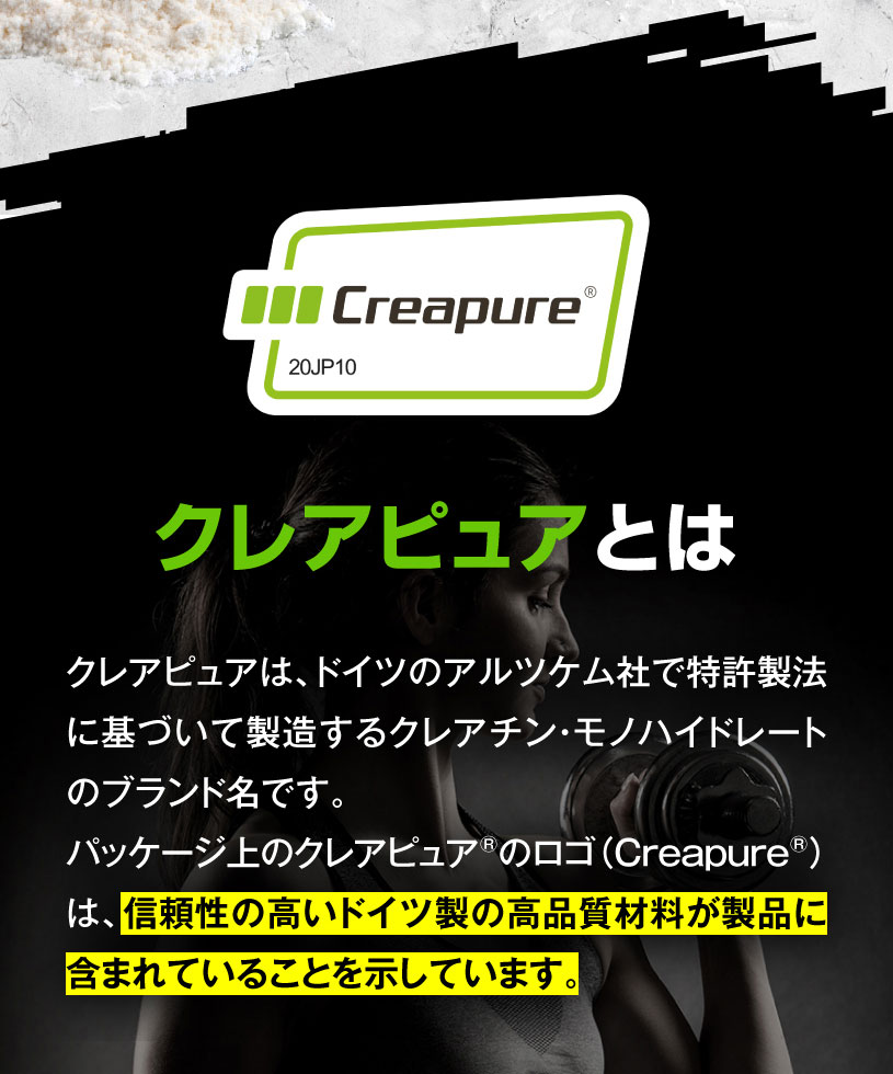 世界最高品質のドイツ製 クレアチン・モノハイドレート 「クレアピュア®」を100%使用。