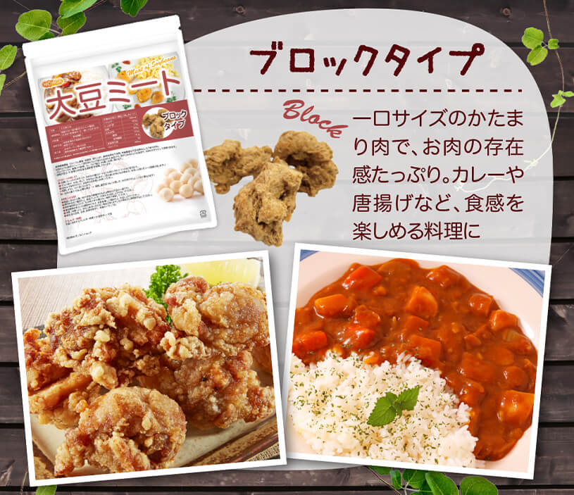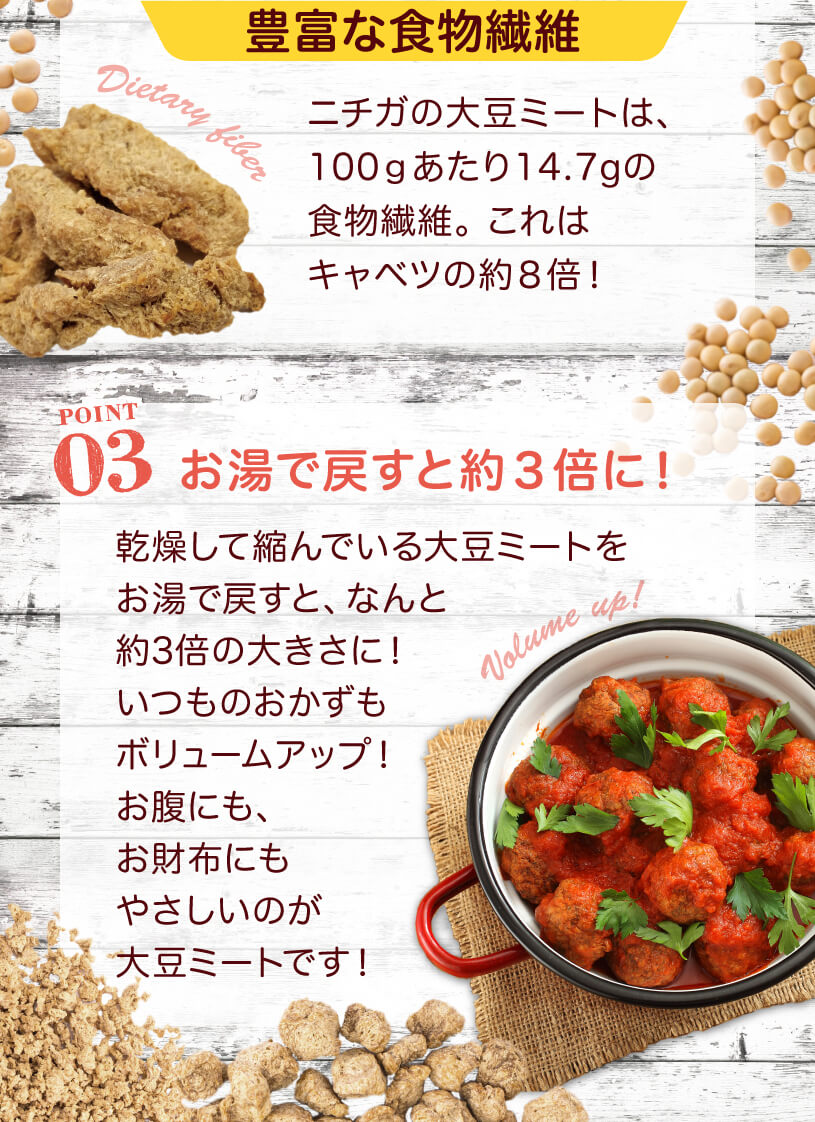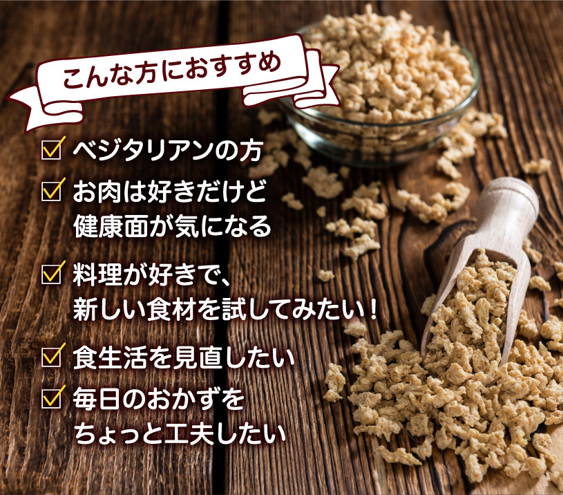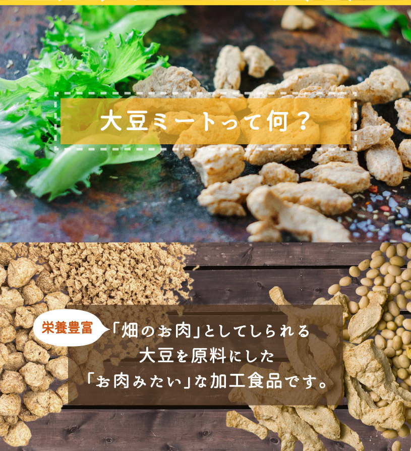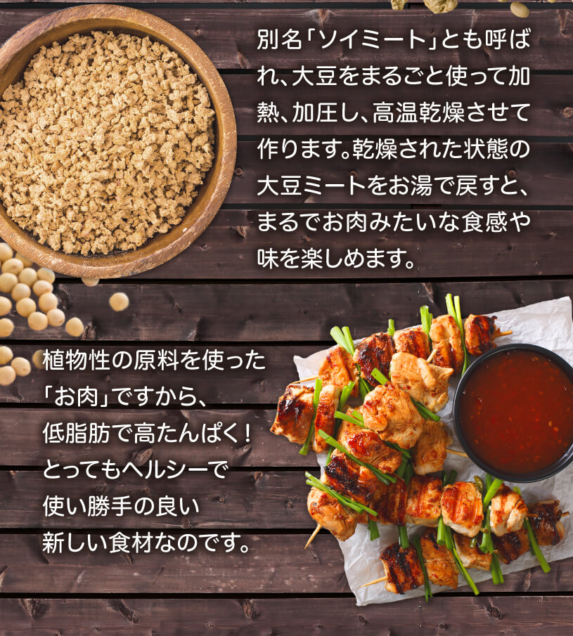 食物繊維豊富、カルシウム豊富、低脂肪、高たんぱく、動物性原料不使用。栄養豊富な大豆を原料とした「畑のお肉」。