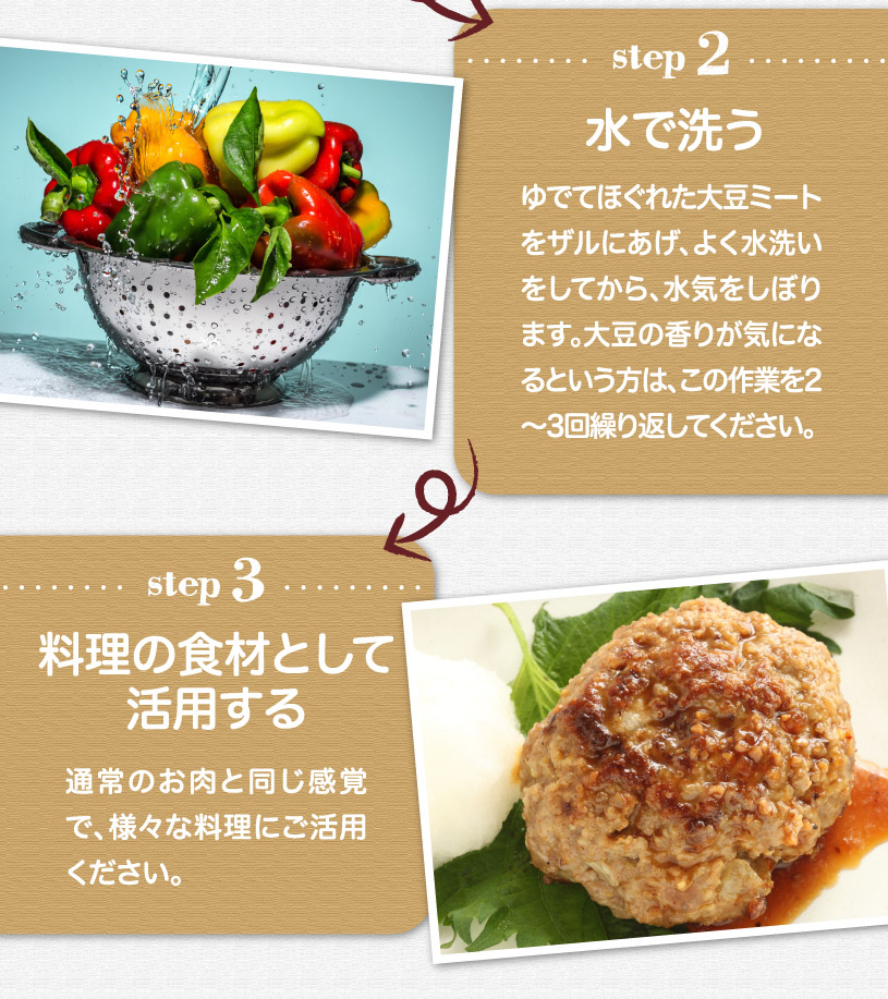 (1)お鍋にたっぷりの水を入れ、お好みの量のミートを入れ弱火で約2~5分ほど茹でます。 (2)ザルにあげ、水洗いをして、水気をよく搾ります。(豆の香りが気になる場合は、水洗いと搾りを2~3回繰り返します。) (3)お好みで味を付けたり、お好きなお料理にお使いください。 *湯戻しすると、約3倍になります。 〔例〕お肉分量で150g必要な場合→湯戻し量目安50g(※戻し方、水の切り方によって多少異なります) |