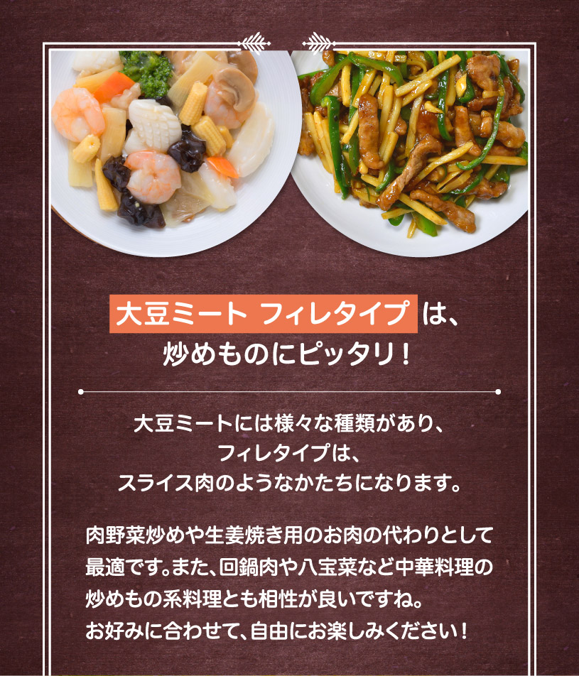 フィレタイプは、しょうが焼き、回鍋肉、八宝菜など幅広い料理にお使い頂けます。