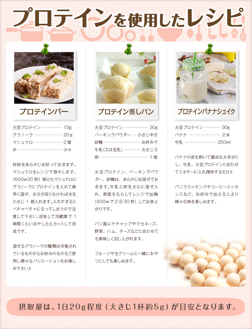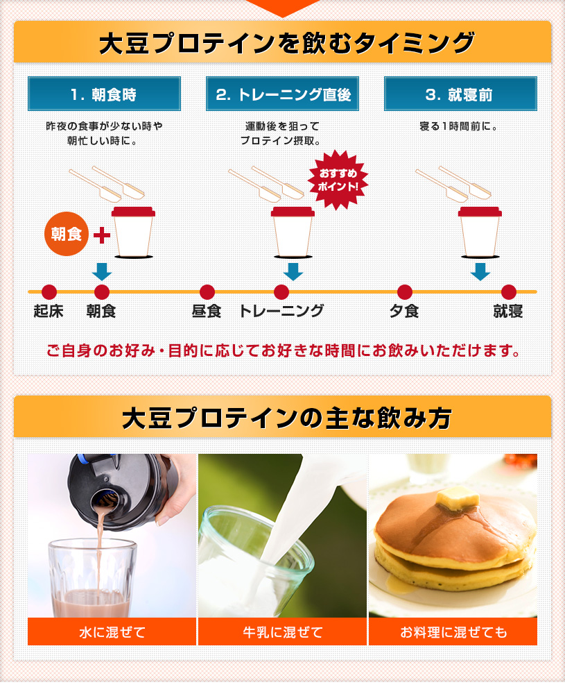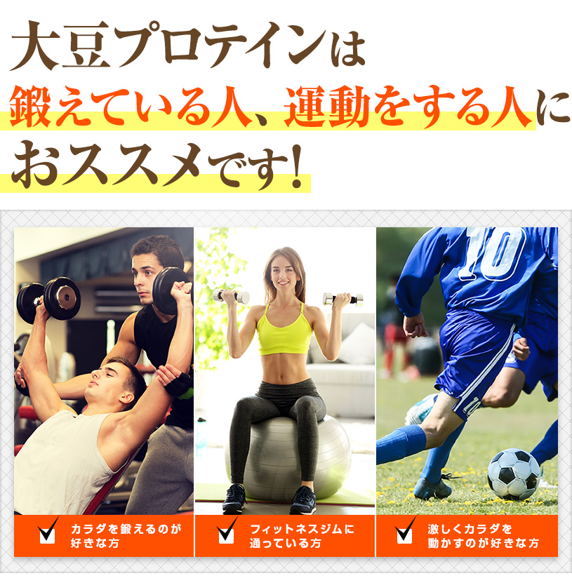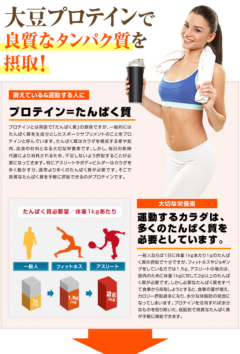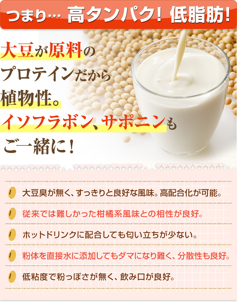 脂肪分が少なく、植物性のタンパク質を豊富に含んでいる大豆を原料としており、分解・吸収に比較的時間がかかり、ダイエット・理想的なカラダづくりをサポートします。