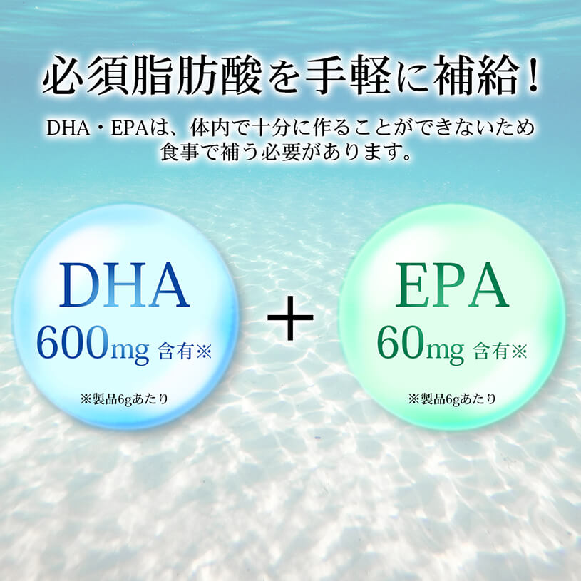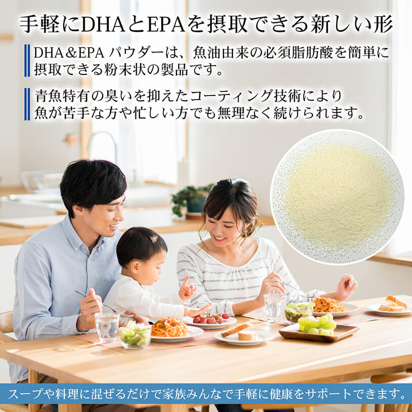 DHA&EPAパウダーは、製品6gあたりDHA600mg、EPA60mgを含有し、健康を気遣う方におすすめです。脱臭・脱味された魚油を使用し、魚特有の臭いが気にならないコーティング仕様で、魚が苦手な方にも最適。水への分散性が高く、スープやドリンク、料理に手軽に混ぜられます。日常の食事に取り入れやすく、家族みんなで楽しめる便利さが魅力。料理と一緒においしくDHA&EPAを摂取して、健康的な毎日をサポートします!