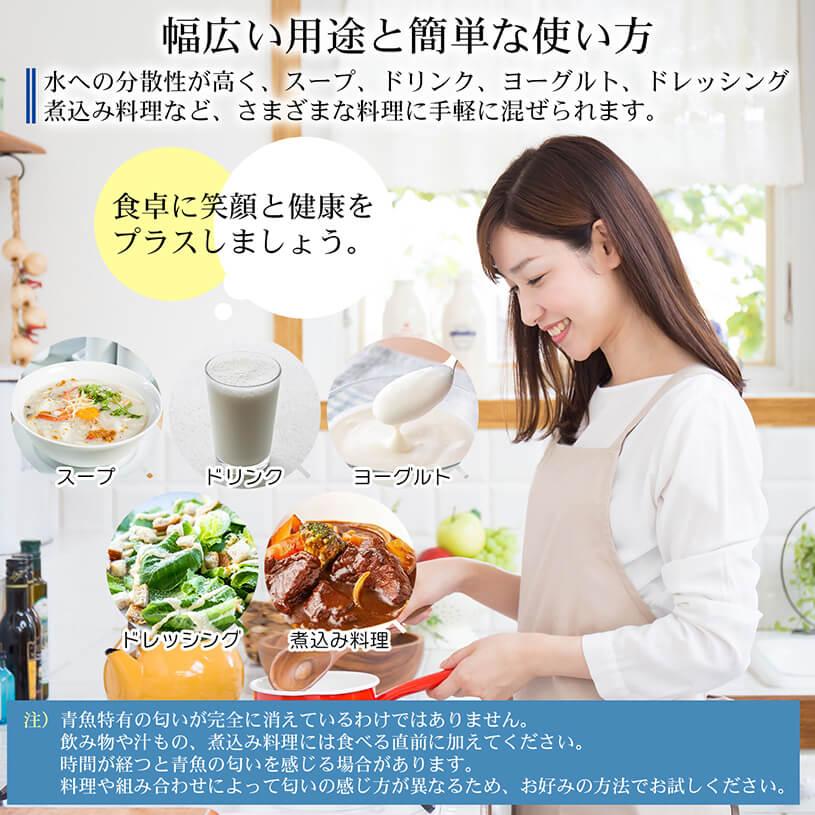 1日6~10gを目安に料理、飲み物に加えてお召し上がりください。 飲み物、汁もの、煮込み料理にご使用の際は食べる直前に本品を入れてください。 時間が経過するとコーティングで閉じ込めた青魚臭がする事がございます。 |