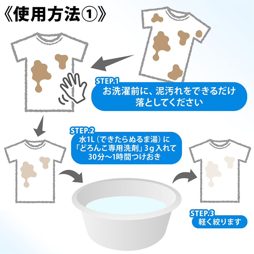 ◆通常の汚れ 水30Lに対して、「どろんこ汚れ専用洗剤」を30g入れ、洗たくしてください。 ◆ひどい汚れ 水5Lに対して、「どろんこ汚れ専用洗剤」を15g入れ、よくかき混ぜた後、洗たく物を30分~1時間つけおきしてください。 その後、汚れた水を捨て、軽く絞った後、「通常の汚れ」の方法で洗濯してください。 ・2時間以上のつけおきは避けて下さい。 ・金属類(ファスナー、ボタン、フックなどの留具)が付いた衣料のつけおきは、1時間以内にしてください。 ※ お洗濯前に、泥汚れは乾いた状態で、できるだけ落としてください。 ※ つけおきは40℃程度の温水を使用すると一層効果的です。 ※ 水が冷たい場合や、洗たく物を入れすぎると溶け残りが出ることがあります。 |
