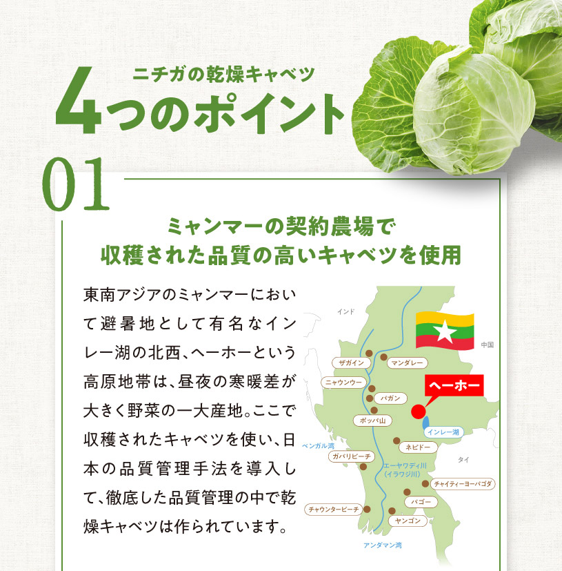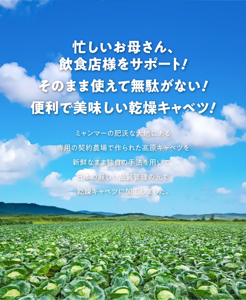 ミャンマーの肥沃な大地にある専用の契約農家で作られた高原キャベツを、新鮮なまま日本の品質管理のもと乾燥キャベツAD(エアドライ)製法にて加工しました。 破棄がなく100%お使いになれます。