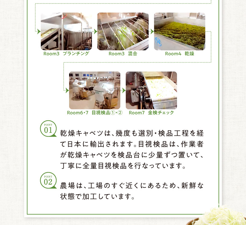 選別・洗浄(3回)⇒選別⇒切断⇒ブランチング⇒乾燥⇒目視検査(2回)⇒金検チェック⇒国内搬入⇒目視検査⇒充填⇒検品・箱詰工程