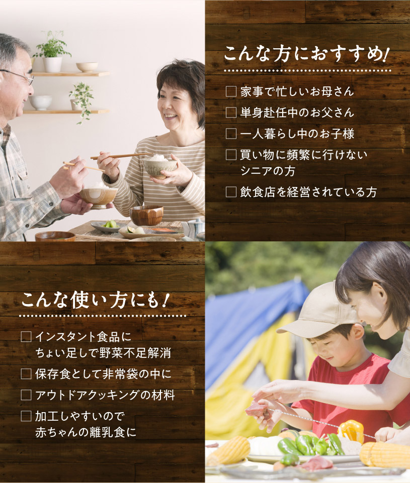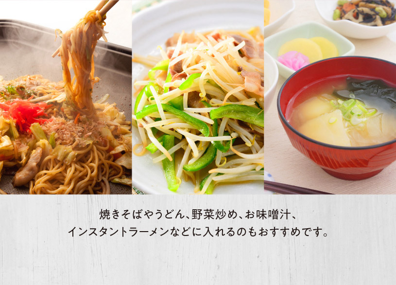 お味噌汁、焼きそばやお好み焼き、サラダ、炊き込みごはんの具、野菜炒めなど様々なお料理にお使い頂けます。 【常温で1年 保存食としても最適】 常温で1年保存ができますので、保存食としても最適です。無駄なく必要な分だけ使用できますので、大変便利で、野菜不足の解消に役立ちます。 |
