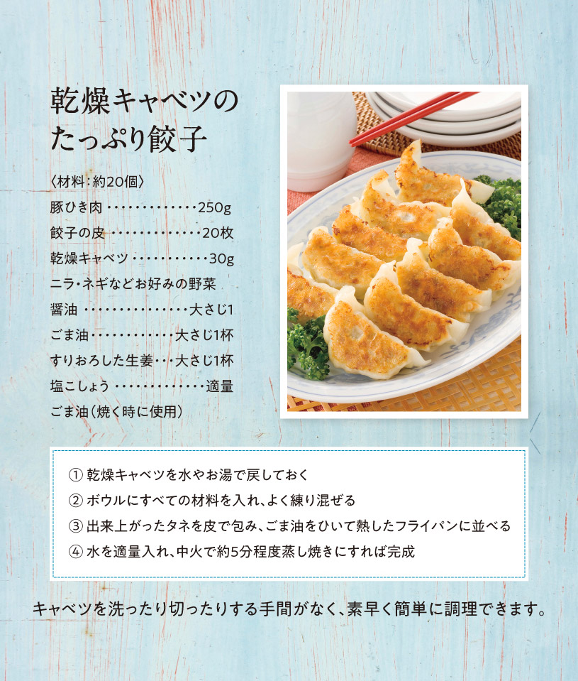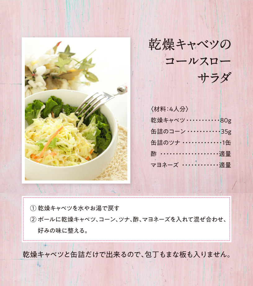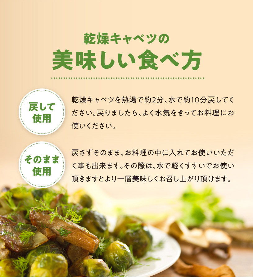 ・お味噌汁、カップラーメン、その他の汁物には、お鍋にそのまま入れるだけです。 ・乾燥キャベツを熱湯で約2分、水で約10分戻してください。戻りましたら、よく水気を切ってお料理にお使いください。戻さずそのままお使いいただく事も出来ますが、軽くすすいでお使い頂きますとより一層美味しくお召し上がり頂けます。 |