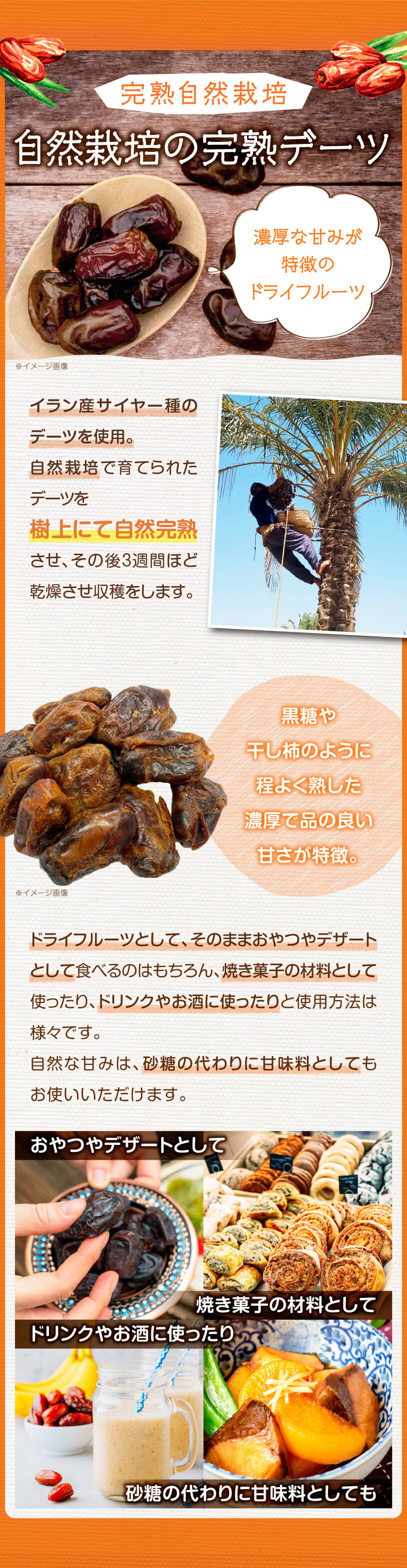 自然栽培で育てられた完熟デーツは、樹上でしっかり熟してから約3週間乾燥させて収穫されます。