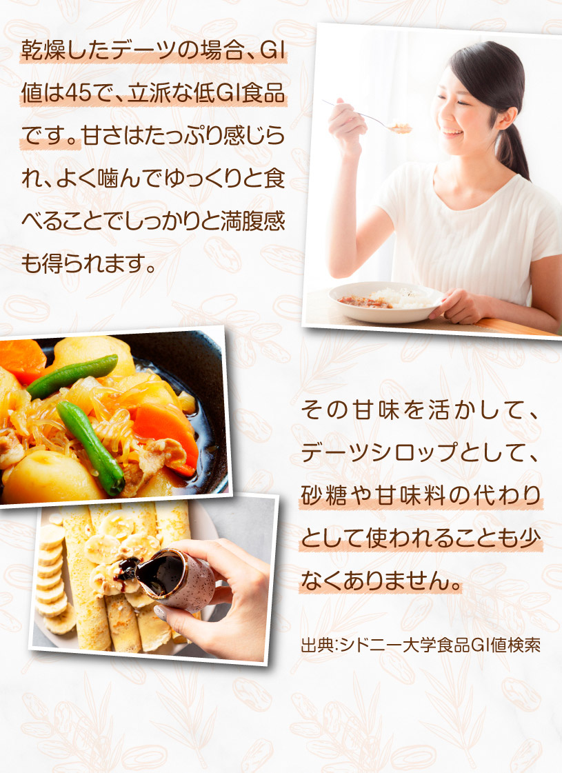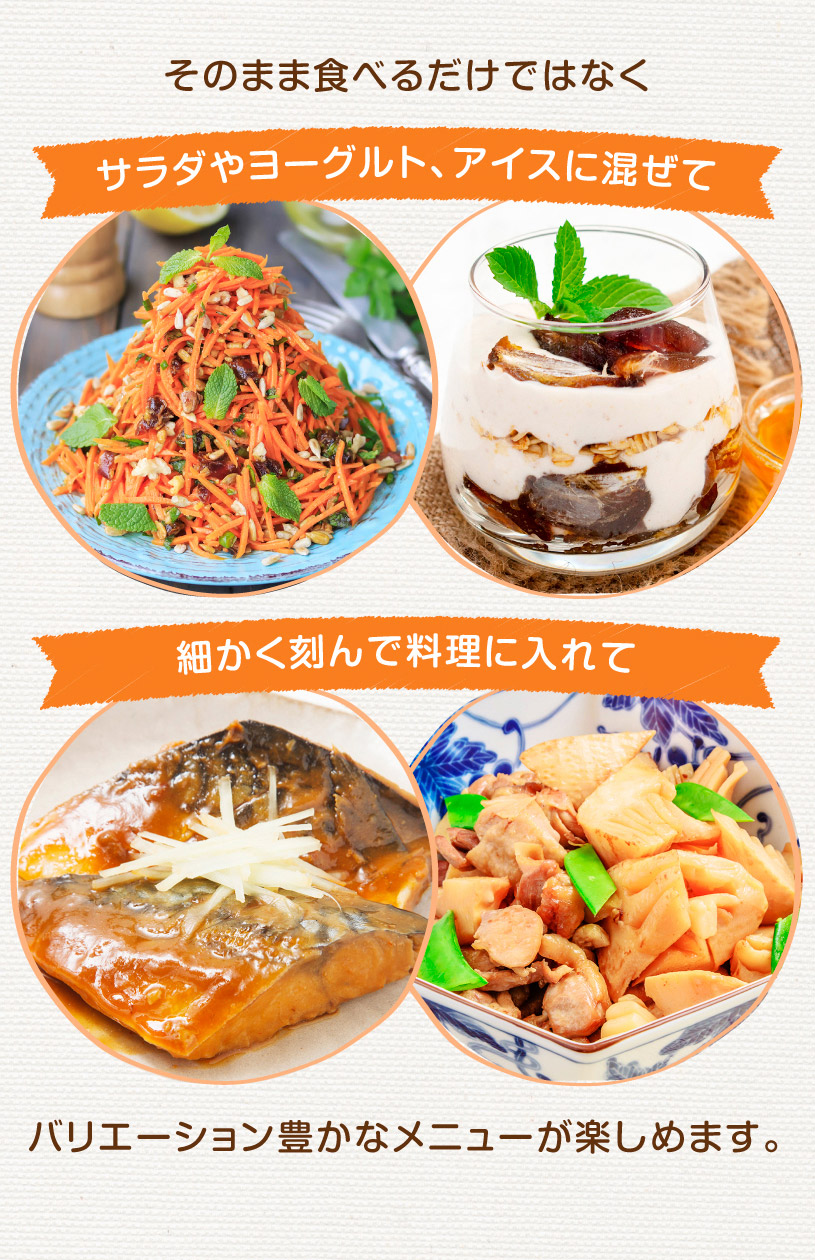 黒糖や干し柿のような濃厚で上品な甘さが特徴です。ドライフルーツとしてそのまま食べるほか、お菓子作りや飲み物にも使えます。