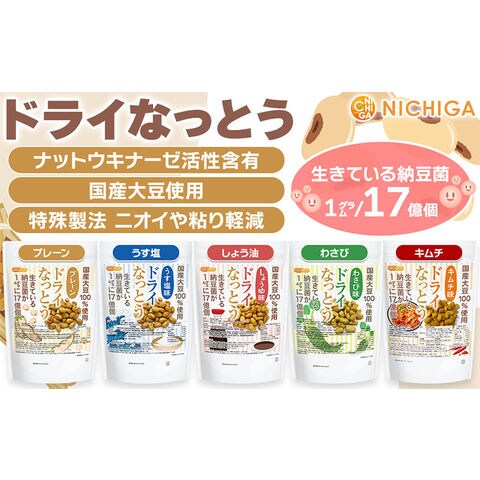 色々楽しめるドライなっとう5種類<プレーン><うす塩味><しょう油味><わさび味><キムチ味>を、お得なセットに。