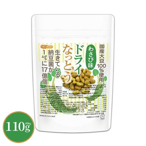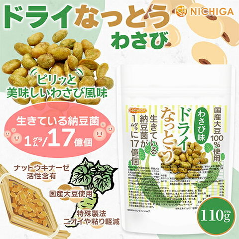 ドライなっとう <わさび味> 110g 【送料無料】【メール便で郵便ポストにお届け】【代引不可】【時間指定不可】 国産大豆100%使用 DRY NATTO 生きている納豆菌17億個 ナットウキナーゼ活性含有 [05] NICHIGA(ニチガ) 低温フライ特殊製法