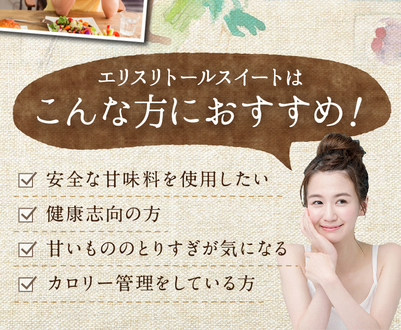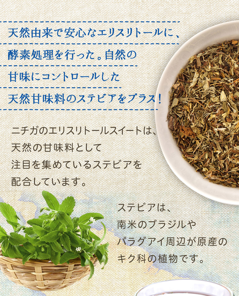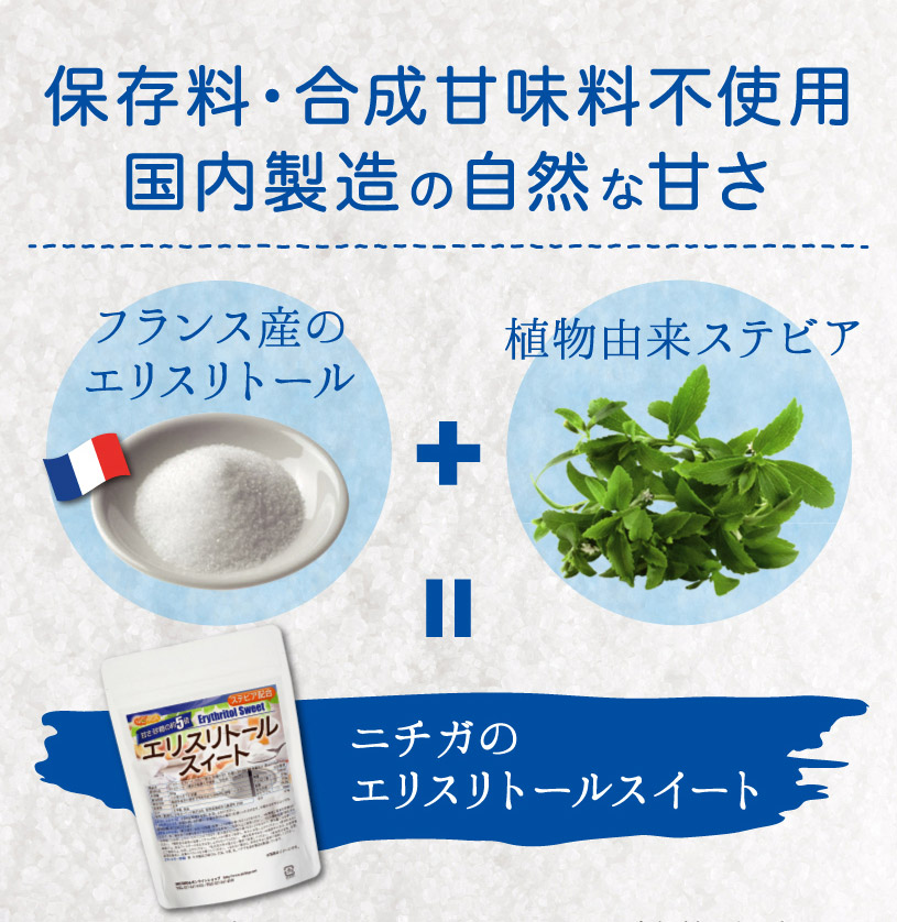 NICHIGAのエリスリトールスイートは、保存料・合成甘味料不使用の自然由来低カロリー甘味料です。