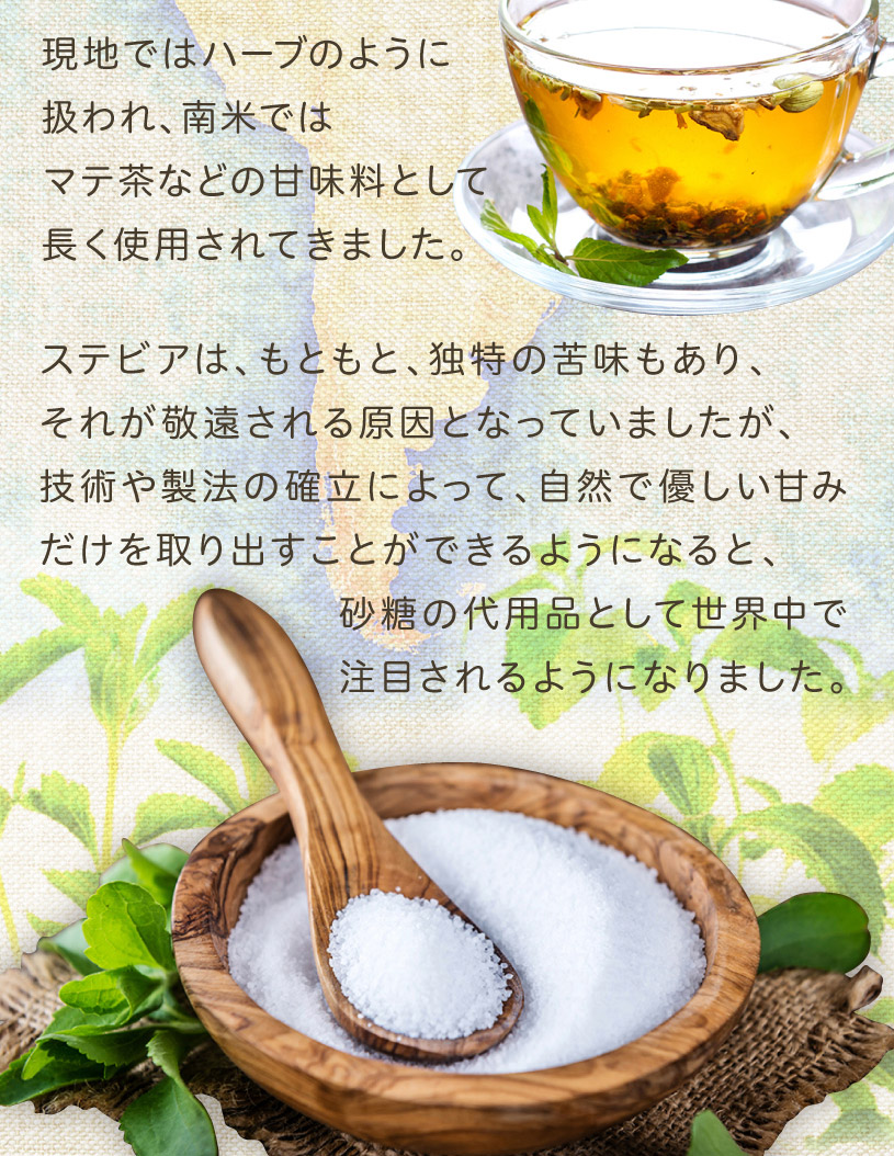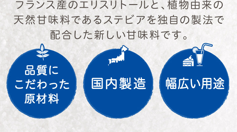 遺伝子組換えでない とうもろこし由来のフランス製造エリスリトールと国内製造の植物由来ステビアを使用して独自の新製法で配合致しました。ステビア甘味料は、キク科の植物ステビアの葉から抽出・精製した天然系の甘味料です。