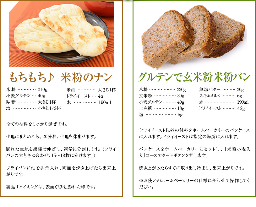 小麦粉などでパンを作る際には、小麦粉に対して2~3%を置き換えてご使用ください。米粉パンには、米粉分量の10~20%を置き換えてご使用ください。