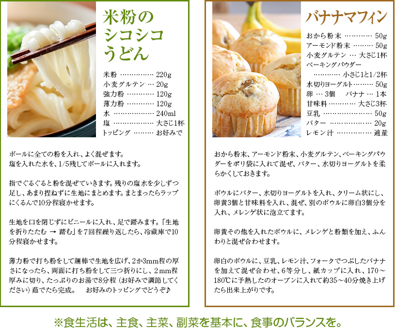 パンや米粉パンを作る際にご使用いただくと、ボリュームが出てふんわりソフトな仕上がりになります。パスタやうどんなどの麺を作る際に加えていただくと、コシが強くなります。