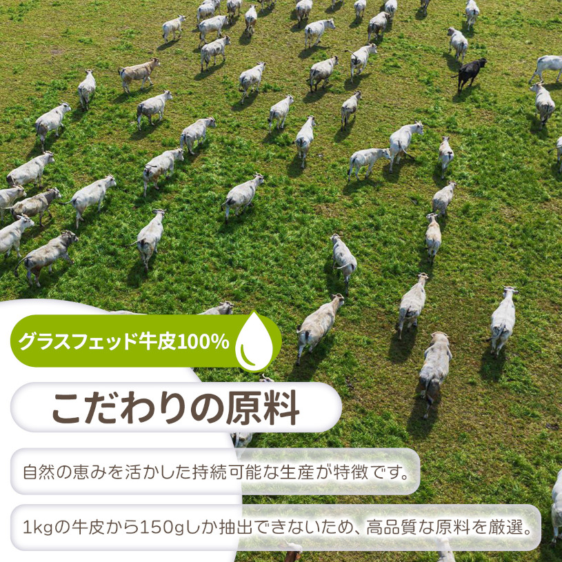 ブラジルの牧草地で育ったグラスフェッド牛から抽出した高純度なコラーゲンを使用。