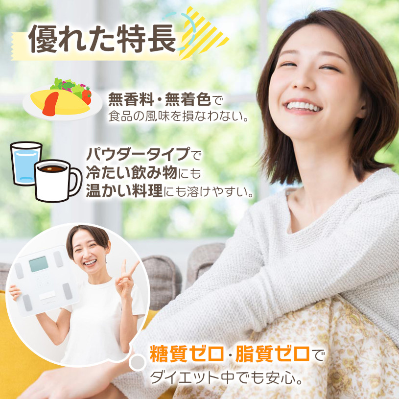 無香料・無着色、グルテン&ラクトースフリーで、飲み物や料理に簡単に取り入れられる美容と健康サポートサプリメントです。