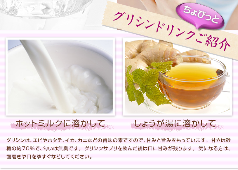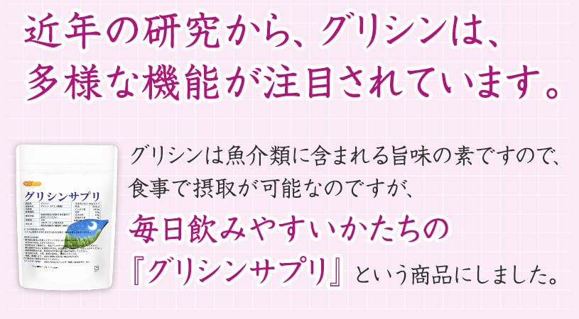 グリシンは、非必須アミノ酸に分類されるもっとも単純な構造のアミノ酸で、動物性タンパク質、特にゼラチン(エビやホタテ、イカ、カニなどの魚介類)などに多く含まれます。白色の結晶で、旨み、甘味があり、水に溶けやすいという特徴があります。