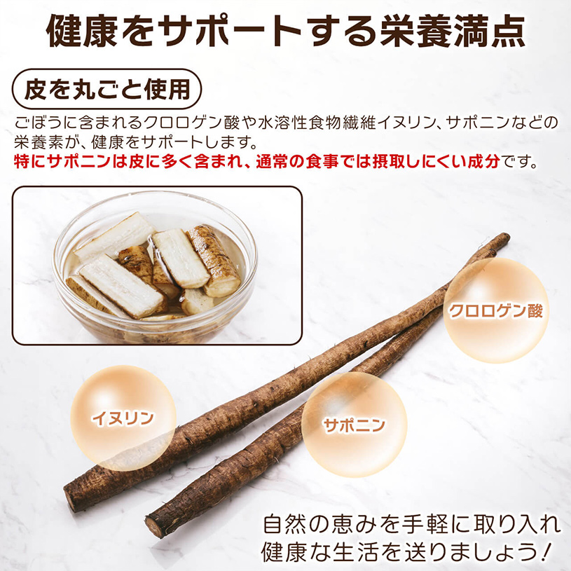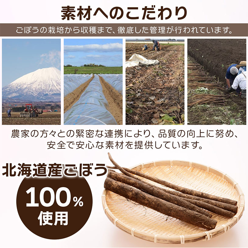 北海道産の旬のごぼうを厳選し、皮に近い部分だけを使用して、丹精込めて粉末にしました。清らかな大地の恵みを閉じ込め、食物繊維も豊富に含まれています。