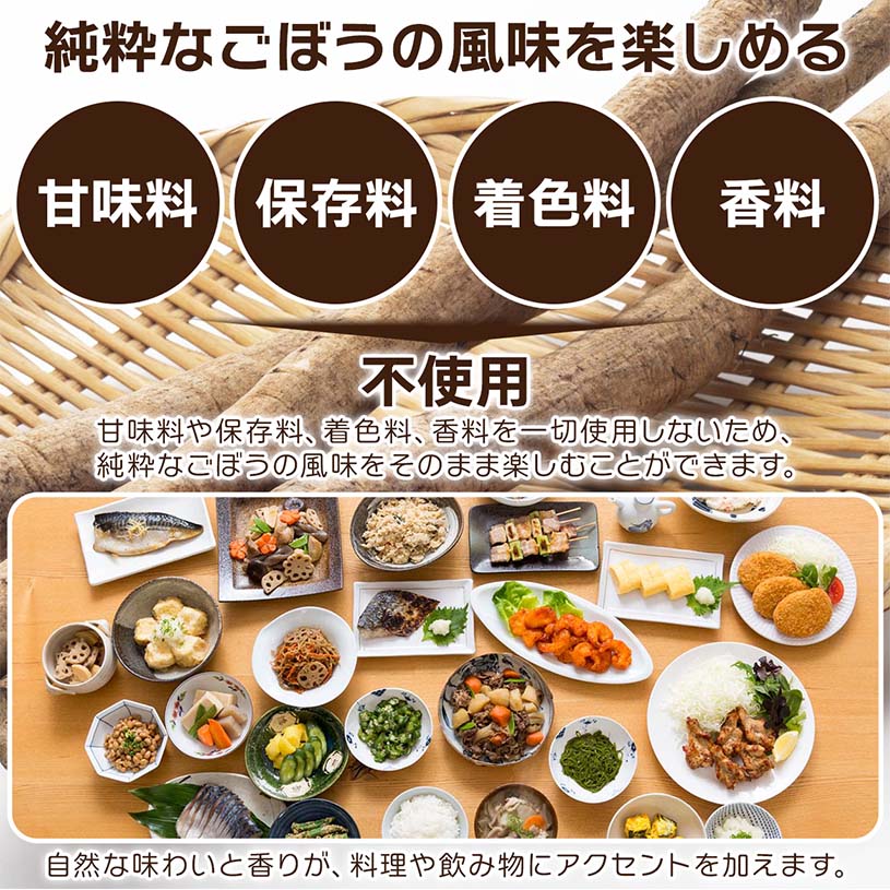 甘味料、保存料、着色料、香料を一切使用せず、純粋な100%のごぼうパウダーです。
