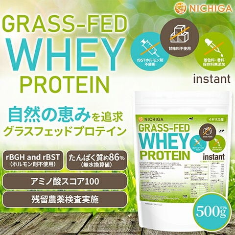 GRASS-FED WHEY PROTEIN instant(イギリス産) 500g 【送料無料】【メール便で郵便ポストにお届け】【代引不可】【時間指定不可】 rBSTホルモン剤不使用 甘味料不使用 着色料・香料・保存料無添加 WPC 自然の恵み [01] NICHIGA(ニチガ)