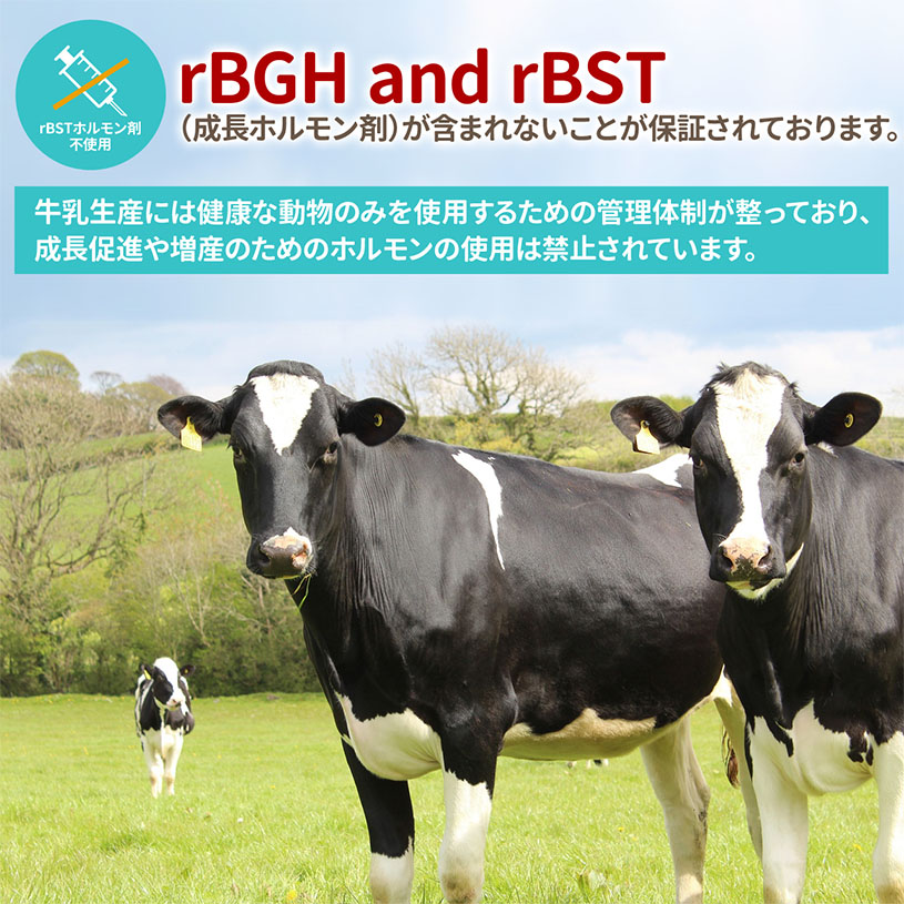 rBST(成長ホルモン剤)が含まれないことが保証されております。 牛乳生産には健康な動物のみを使用するための管理体制が整っており、成長促進や増産のためのホルモンの使用は禁止されています。 |
