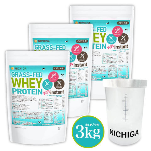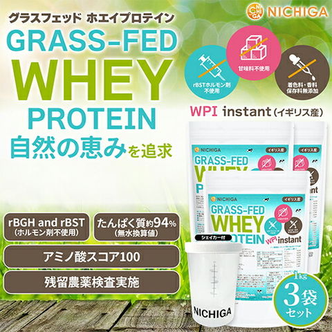<シェイカー セット> グラスフェッド ホエイプロテイン WPI instant (イギリス産) 1kg×3袋 【送料無料!(沖縄を除く)】 rBST不使用 高たんぱく 甘味料不使用・保存料無添加 NICHIGA(ニチガ) TK2