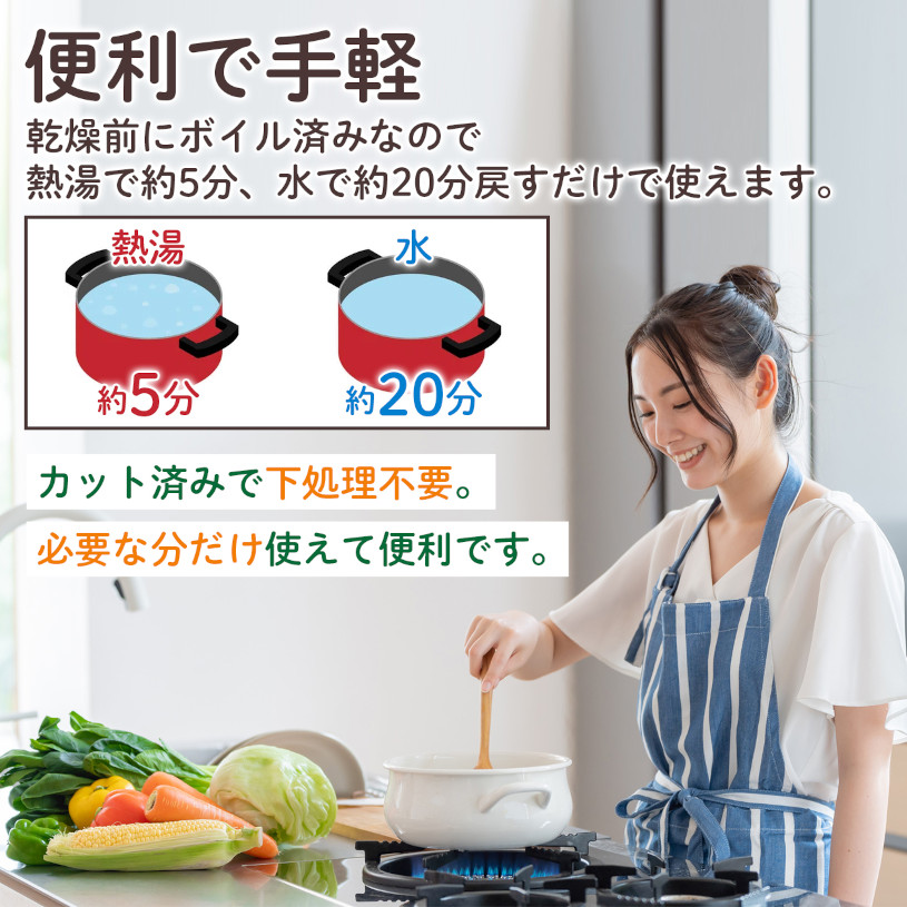 お味噌汁やカップラーメンなどの汁物を作る際は、水の状態から具を入れて下さい。 乾燥した状態から使う場合は、熱湯で約5分、水で約20分戻してください。 みそ汁以外にも和え物、サラダ、炒め物として活用いただけます。 |