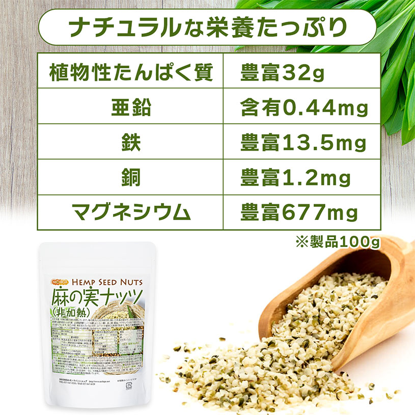 麻の実ナッツは外殻を取り除いた中身の部分で、消化吸収のよい良質な植物性たんぱく質、必須脂肪酸(リノール酸:αリノレン酸)、鉄、銅、亜鉛、マグネシウムを大変バランスよく含んでいます。