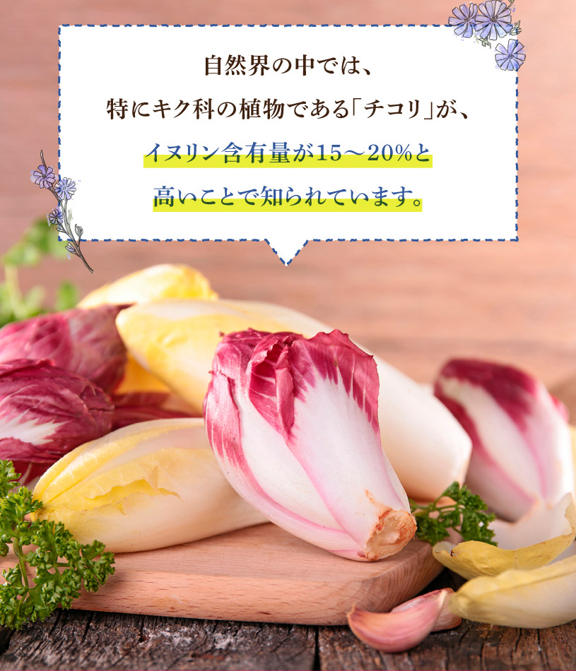 ヨーロッパの豊かな土壌で太陽の光を浴びて育ったチコリの根から抽出したオランダ産の天然イヌリンです。