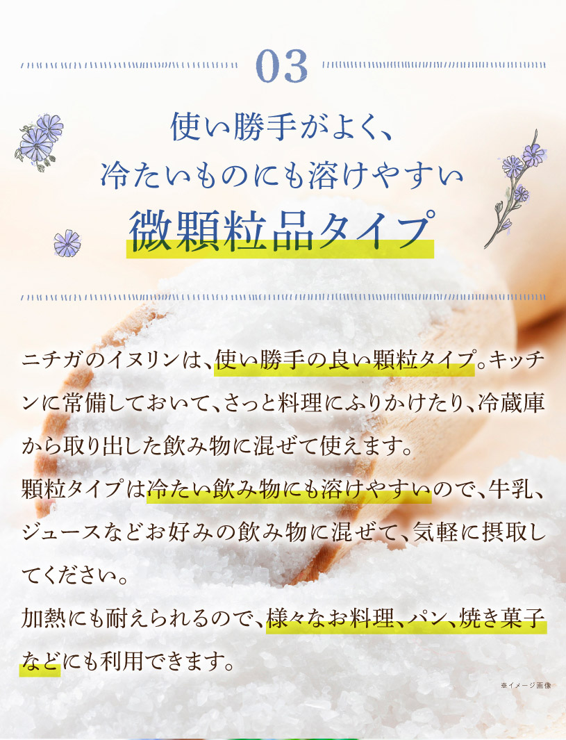 イヌリン総食物繊維量は90%以上含有しています。残留農薬実施済み。冷たいものにも溶けやすい微顆粒品タイプです。