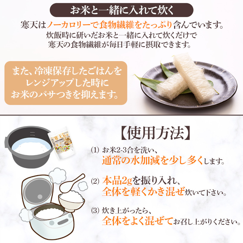 国内製造された粉末寒天は、天草やオゴノリ海草から作られ、植物性食物繊維が成分の約8割と豊富に含んでいます。