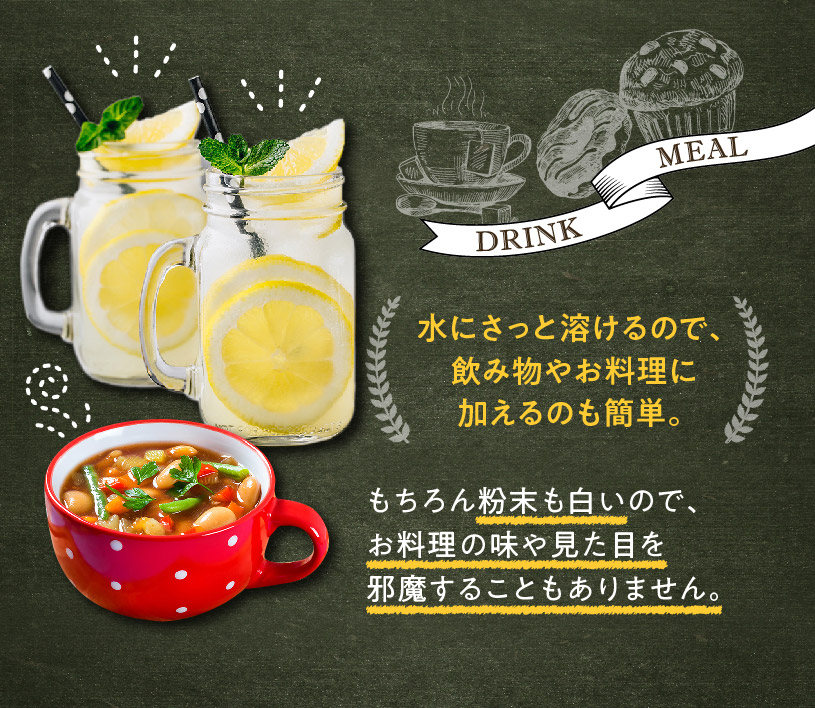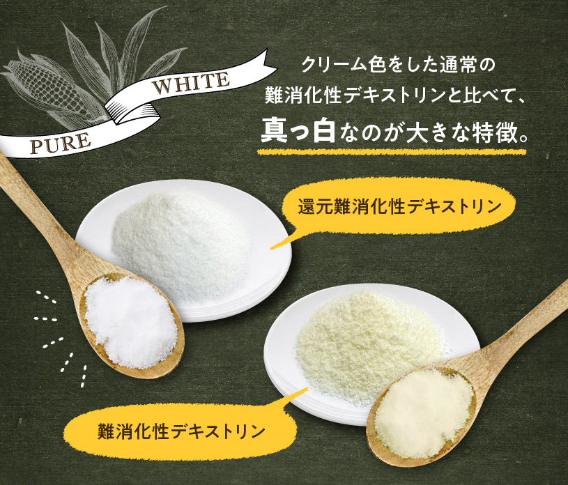 難消化性デキストリンに水素を添加することで、真白な粉末 還元難消化性デキストリンとなります。低粘性で水にもサッと溶けおいしさそのまま 無味無臭でいろいろな料理に入れることができます。