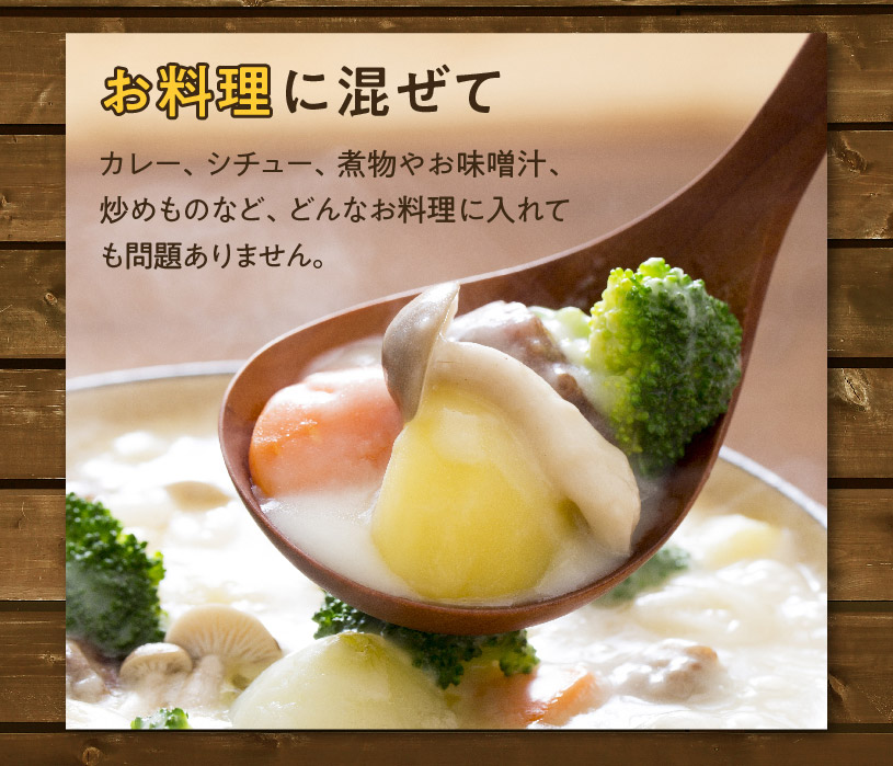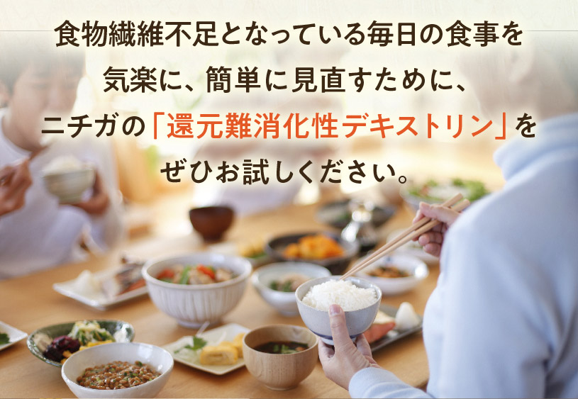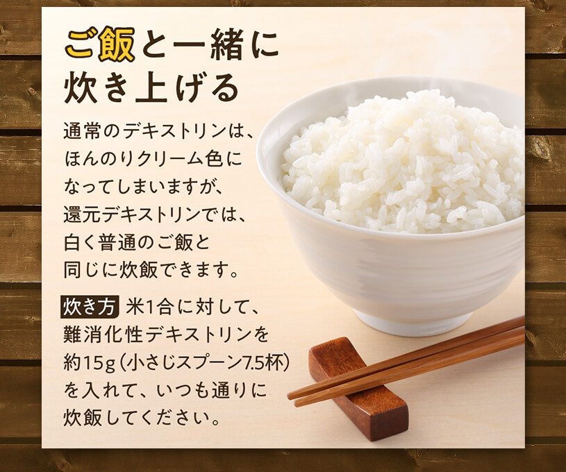 ○食物繊維を補給できる補助食品として、1日10g程度を目安に、お茶やコーヒー・ジュースなどの飲み物やお料理などに溶かしてお召し上がりください。 (小さじスプーンすりきり1杯約2g) ○1日の使用量を1回でご使用いただくよりは、1日2~3回に分けてご使用ください。 〇ご飯を炊く時に水にプラスして、白くて艶やかな、食物繊維入りごはんが手軽に炊けます。 ご飯は冷めてもおいしさ持続!(※米1合に本品約15g) |